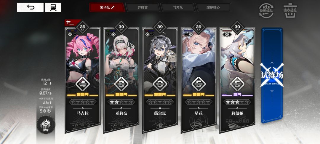 ----前文提醒,这个游戏打怪更讲究卡牌间的联动配合,不建议萌新梭哈单个满命ssr角色。建议萌新在组好攻坚队和割草队后多开图鉴,每个角色的共振一四五能解锁跑商词条,并且后期更换配队搭配更灵活。常用队伍需要抽取关键觉醒。 第一个紫卡是攻坚队,适合开荒及后期攻坚,平时挂机。中后期启动慢,出伤慢,不适合平时跑商。角色种类需求高且刚需亚立奈二觉。氪老或者觉得自己够欧可以尝试这队开荒,后期转型新星队和奇异