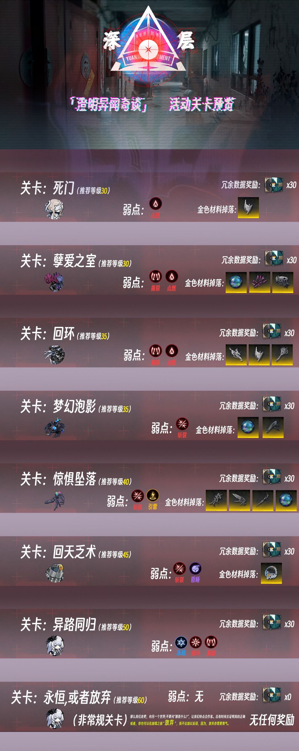 关卡BOSS及其弱点 对应关卡奖励的【冗余数据】数量 对应关卡BOSS可掉落的金材料