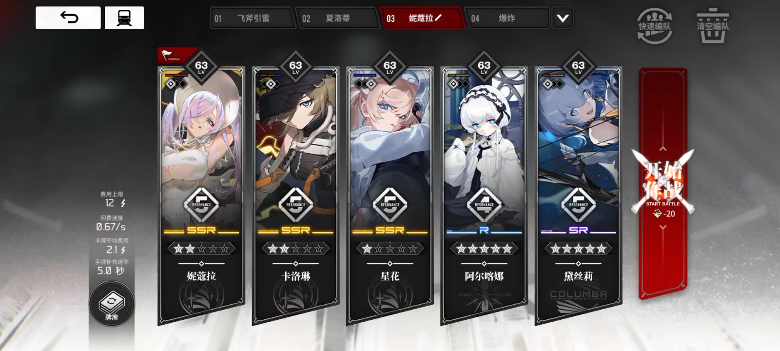 苔妮的蓝卡联动让很多蓝卡可以给柯娜加回转了 比如跳鼠和叶钰 队伍组合 柯娜 苔妮 苍叶 卡洛琳 叶钰 那么这个队的回费有高回转的队长技回费 苔妮的冰封回费 冻结由柯娜和苔妮提供 卡洛琳的引雷回费 抽卡过牌有卡洛琳的过牌卡和队长技抽卡 苍叶的黄卡 练功有苍叶的扇子和蓝色虚幻更多的蓝卡护盾让蓝色虚幻叠的更多了