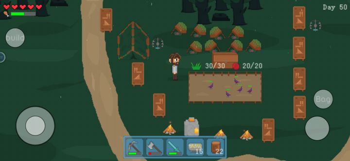 玩了一下午,死了N次,最高记录是Day12。其实玩法实在是单一,虽然游戏可以存档,但是死了以后是不可以读档要重新开始的。常常好不容易攒够物资准备大显身手的时候一个不小心,唉,被怪抓几下抓死了。怪会随着存活时间的增加移动速度变快,全程没有新手教程,只有营地跟山洞有提示。银矿金矿砖石矿无法采集,可能是需要提取青铜矿获得材料再获得青铜镐来采集吧(结束的太快没有刷新发现过青铜矿)个人推荐建造顺序是:工作台-帐篷-熔炉-储物箱,准备好材料等需要的时候再建🔥跟养殖动物的栅栏。帐篷非常重要,每次退出游戏的时候一定要记得先回⛺里休息下保存游戏进度再退出,不然没存进度要重新开始。前期食物不够可以一次吃两三个果子,等🍗没有了开始掉❤️的时候再吃,我玩的时候是控制好果子吃的量够采集当天的物资就可以了不需要吃太多。完全没有🍗的时候可以进⛺睡觉,醒来记得要马上吃果子不然会掉❤️直至死亡!