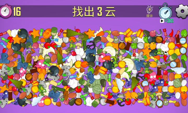 游戏提示过快,建议把提示功能改为手动点击提示按钮或者剩余时间为一定时间才提示,而不是刚过几秒就给提示,不然倒计时没有太大的意义。这个游戏很考验眼神,刚开始玩的时候觉得好简单,感觉不过如此。但玩到后面物品越来越多,找东西的难度也越来越大了,无聊的时候时一个消磨时间的好游戏。玩到后面的时候要提高注意力,不然很容易看得眼花缭乱,容易点到错的。每一关都会变色避免视觉疲劳,最大的缺点是没有暂停中途如果有点其他事儿都不能暂停,可以做一个全覆盖式的暂停,我觉得还可以做一个小时候的那种图里找图案那种模式,应该也会有很多人玩儿