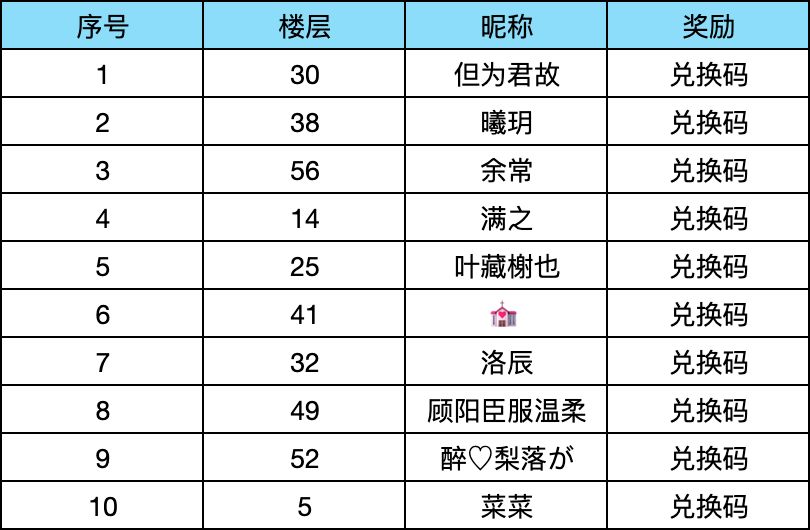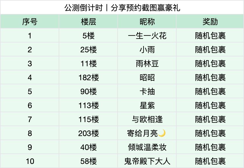 开奖啦,开奖啦!~~~ 获奖的公主也会在评论区回复您通知获奖。 以下是具体的获奖公主名单, 实物奖励将在30天内发放完毕,发放时将会有快递小哥随机包装奖励并随机发放,辛苦获奖公主同步信息后耐心等待~ ------------------------------------------------- 草树已摇落,山川尚郁苍。 百事择佳日,佳日唯晴阳。 忽闻公测即将来临,公主殿下在不经意间会看见很多