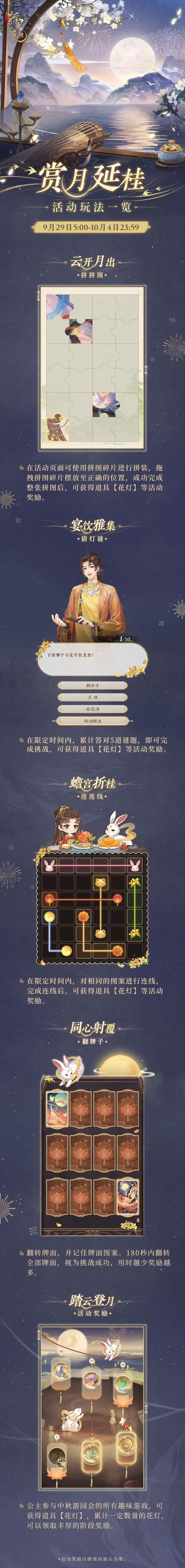 今年的圆月,也想和名士们一起眺望。 中秋游园会即将开幕,公主可参与拼拼图、猜灯谜、翻牌子、连连线趣味小游戏,获得多种丰厚奖励。 > 活动时间:9月29日5:00-10月4日23:59 > 活动说明:公主参与中秋游园会中的4种趣味游戏,可获取道具【花灯】,积累花灯可获得「心之羽」、「青鸾佩」、「绝世孤本」在内的丰厚奖励。 >>>官网下载: >>>TapTap下载: