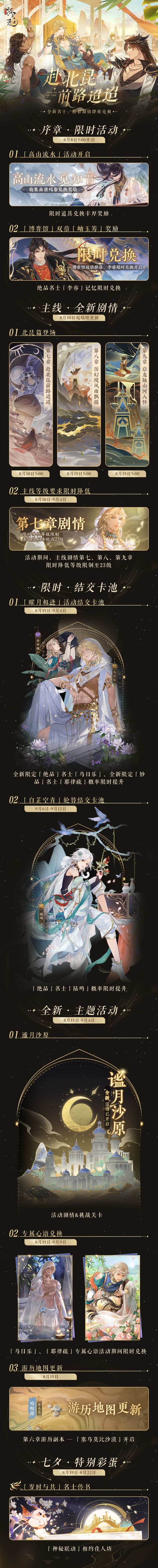 沙海茫茫,骆铃悠扬。和名士踏上北昆之旅,领略独特的异域风光。全新版本「沙海神烬」8月15日正式开启。掌柜已为各位公主整理好活动前瞻长图,一起来看看吧。 【全新名士】 乌日乐、耶律疏全新角色即将亮相 【主线更新】 8月10日起陆续更新第七-九章主线剧情 【限时活动】 谧月沙原限时活动开启,参与活动即可体验【限时活动剧情&玩法】,活动期间「乌日乐」、「耶律疏」结交概率提升,专属心语同步开启兑换。 更多