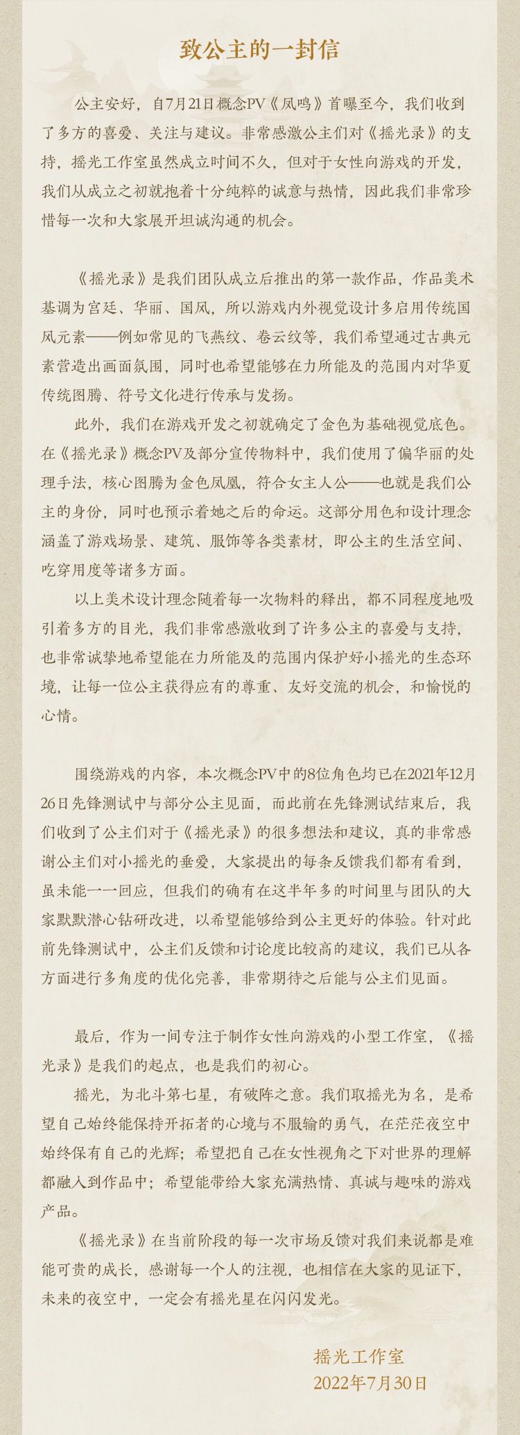 公主安好,自7月21日概念PV《凤鸣》首曝至今,我们收到了多方的喜爱与关注。 我们非常重视每一位公主的宝贵意见与建议,特此奉上一封给公主们的信。 我们会更加努力,争取未来可以给公主们带来更加优秀的作品。