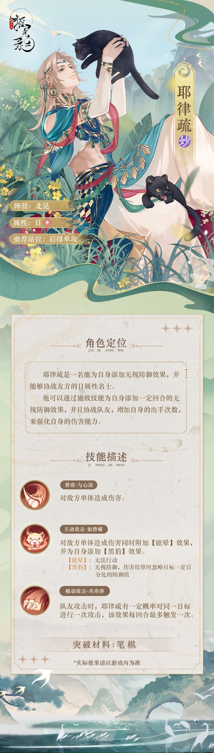 ——“公主不必担心,有我和黑豹为你保驾护航。” 驭兽者,可号令世间野兽为军,生灵为其所用。 名士:耶律疏 配音:书晏 >>>「沙海神烬」版本活动8月15日正式开启,全新名士即将登场。 >>>官网下载: >>>TapTap下载:
