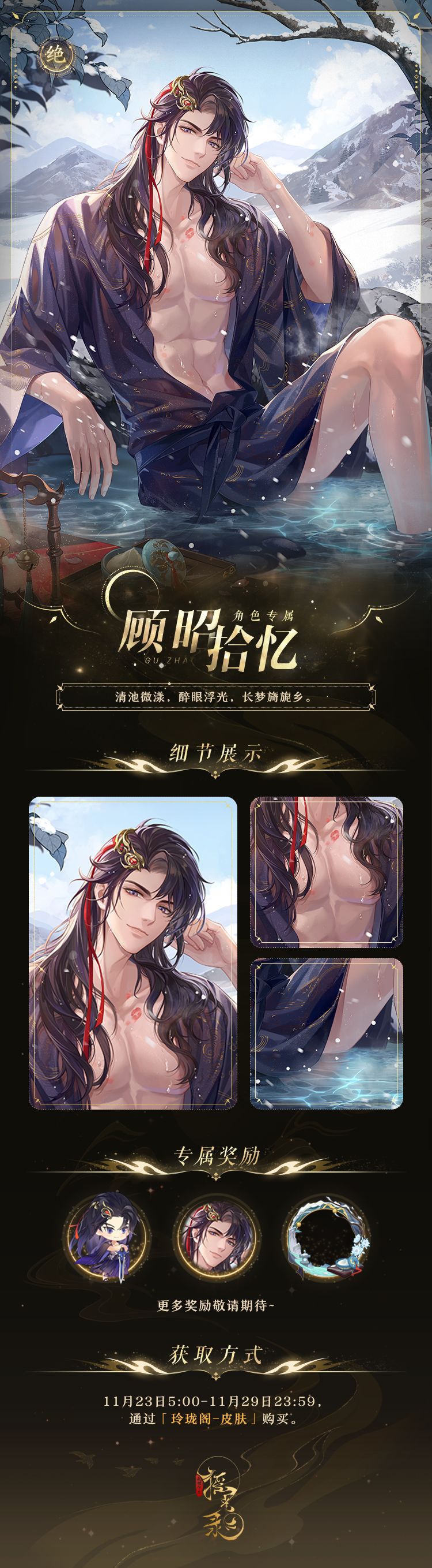 清池微漾,醉眼浮光,长梦旖旎乡。 >11月23日5:00-11月29日23:59,[玲珑阁-皮肤」将上架顾昭拾忆-「濯泉昼暖」。购买后即得顾昭「专属皮肤」、「Q版角色」、「全新语音互动」,提升等级后可得「专属语音剧情」、「头像」、「头像框」、「相思笺」、「流金记忆」等多种福利。 >>>官网下载:https://ygl.miaoacg.com/ >>>好游快爆下载:https://www.3839.