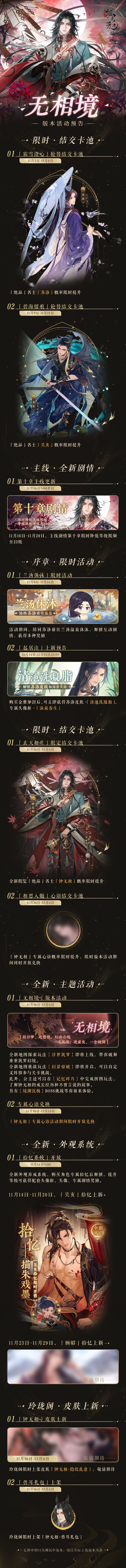 【11月版本情报放送】 「无相境」版本即将登场,公主殿下期待的11月版本前瞻现已解锁,掌柜特意梳理了活动重点,请大家点击长图查收情报。 【主线更新】 第十章主线剧情更新,11月16日-11月29日,第十章限时降低等级限制至23级。 【全新名士】 限定「绝品」名士钟无相即将登场。 【无相境限时玩法】 活动期间开启地图探索玩法「浮世筑梦」、「幻景惊破」以及BOSS挑战玩法「境渊沉极」,公