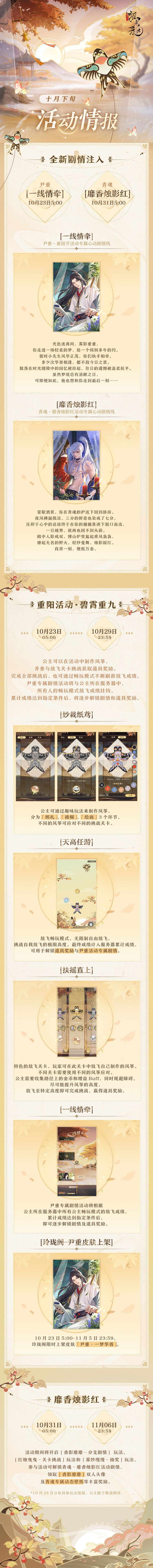 十月深秋,草木摇落,金风玉露,寒气渐生。在秋意渐浓的季节,有幸得名士陪伴。掌柜为大家呈上【10月下旬活动情报】,请公主殿下查收。 【全新剧情注入】 尹重[一线情牵]、青魂[靡香烛影红]活动专属心动剧情即将上线。 【重阳活动·碧霄重九】 公主可在活动中制作风筝,并进行放飞关卡的挑战,获取道具奖励。 【限时活动·靡香烛影红】 活动期间,将开启[靡香烛影红]限时玩法,参与活动可解锁青魂-靡香