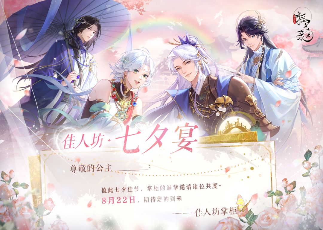 亲爱的公主殿下: 屏风轻启,佳人坊宾客翩翩。杯盏交错之间,众位在此相聚同饮。 七夕宴即将拉开帷幕,管弦悠扬,笙歌鼎沸,天上人间,共赴坊间之约。 ◆您有一份七夕宴邀请函亟待签收,掌柜在此呈上。 ◆欢迎公主殿下分享签名后的邀请函哦~