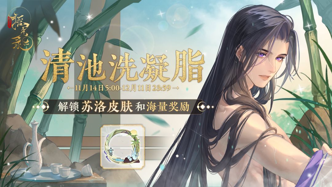 >开放时间:11月14日5:00-12月11日23:59 >奖励简介: 1.公主激活「金册」并且起居注等级达到15级后可领取当期皮肤「苏洛-清池洗凝脂」,该皮肤在本期起居注结束后不会进入「玲珑阁」售卖,且短期内暂无获取途径。 2.公主购买「金册加封」后会立即提升至15级,可直接解锁当期皮肤「苏洛-清池洗凝脂」,并额外获取青鸾佩*500、当期专属头像框「沐泉春生」奖励。 >规则介绍: 1.起居注奖励