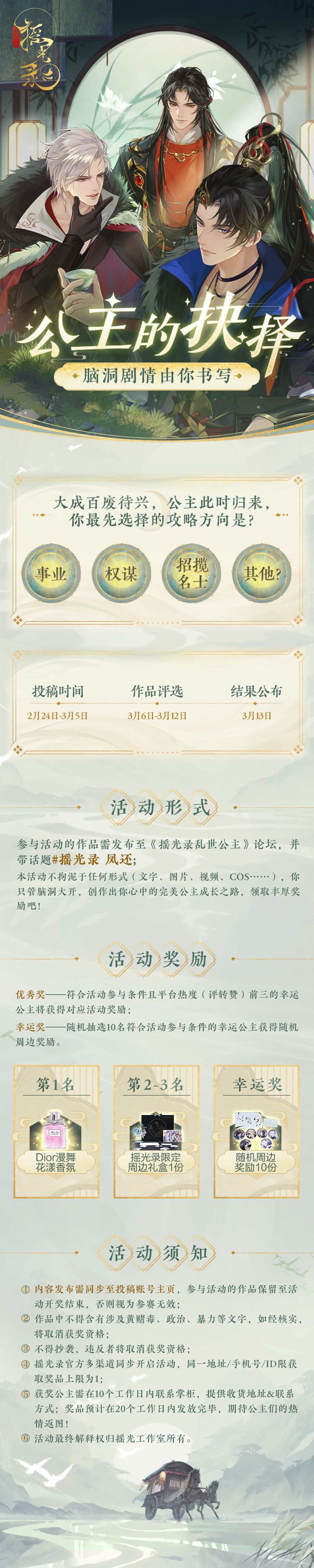 大成四方离乱,朝廷动荡不安。 公主此时归来,想必心里早有应对之法。不知公主准备从何处入手改变现状,谋求生路,甚至……走得更高更远呢? 快快参与以下活动,脑洞剧情由你书写,创作你心中的完美公主成长之路,还有好礼等你赢取! >>>全新官网正式上线,点击解锁豪礼,试听更多名士语音: >>>TapTap预约: