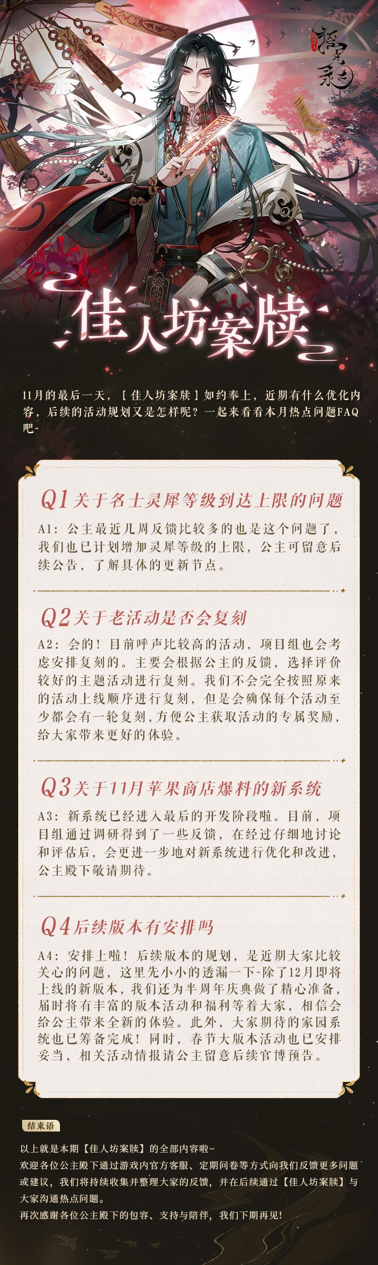 11月的最后一天,【佳人坊案牍】如约奉上,近期有什么优化内容,后续的活动规划又是怎样呢?一起来看看本月热点问题FAQ吧~ *佳人坊案牍中提前爆料的内容,最终实装形式以更新公告为准。 >>>官网下载:https://ygl.miaoacg.com/ >>>TapTap下载:https://www.taptap.cn/app/226664