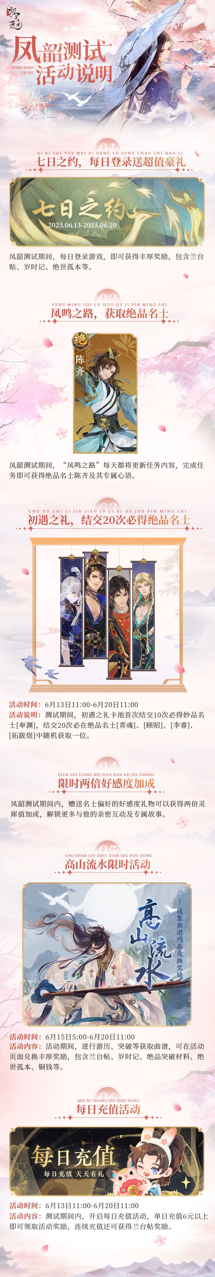 活动时间:9月6日5:00-9月12日23:59 活动说明:活动期间将开启轮替提升卡池[白芷空青],[绝品]名士[陆鸣],获取概率提升。 *结交活动期间及活动结束后,[绝品]名士[陆鸣]仍可继续通过常驻结交卡池[倾盖如故]获取。 活动规则: 1.[白芷空青]卡池结交1次需消耗1个[兰台帖],可通过玲珑阁购买。 2.[白芷空青]结交活动持续时间内[绝品]名士[陆鸣]结交成功率大幅提升,占[绝品]名士