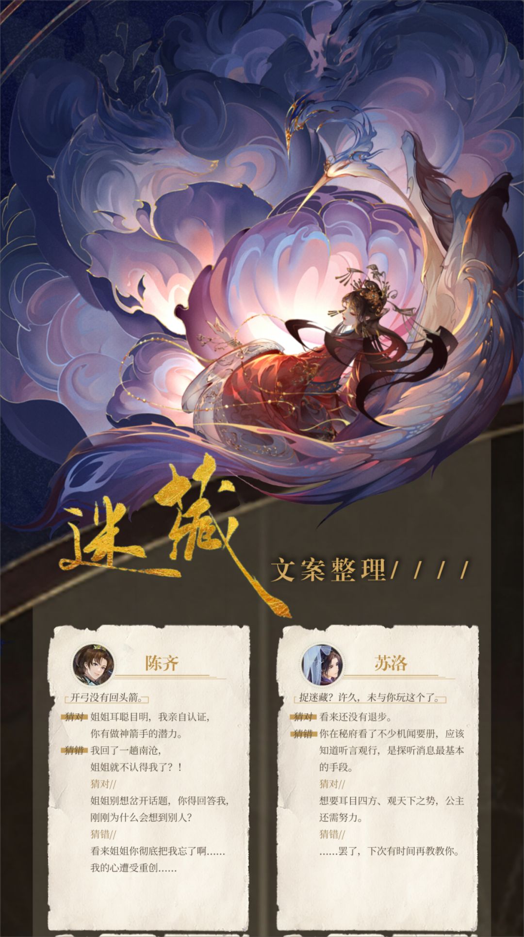 公主殿下日安,奉上截止2023.11.1已发布的全名士捉迷藏游戏文案的汇总整理。 本次整理除进入捉迷藏后名士说的第一句话,还收集了猜对、猜错一次再猜对、两次都猜错的情况下名士的反应。捉迷藏速查攻略可以点击主页查看哦~ 注:捉迷藏从首页“灵犀”入口进入,每天可玩一次,每次游玩有两次“猜一猜”机会,猜对了会获得对应名士记忆和随机名士礼物,两次都猜错就什么都没有哦~ (字可能有点小,推荐保存或放大观看)