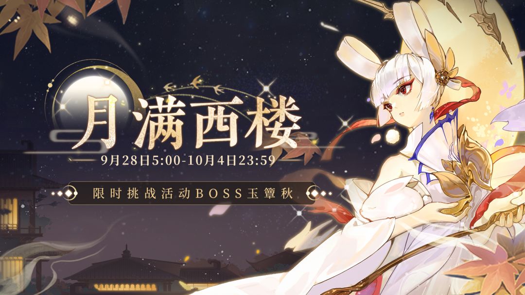 中秋之夜,银汉辉洒;独上西楼,寄相思于明月。 团圆之节将至,掌柜为公主殿下呈上中秋限时活动【月满西楼】的情报。 > 活动时间:9月28日5:00-10月4日23:59 > 活动说明:活动期间,限时挑战活动BOSS玉簟秋,每日可挑战3次。每次挑战后可获得挑战奖励,当天进行1次挑战后可解锁扫荡功能;每日将根据公主对BOSS造成的累积伤害进行排名,并根据排名发放「锦书」等奖励;「锦书」可用于兑换「