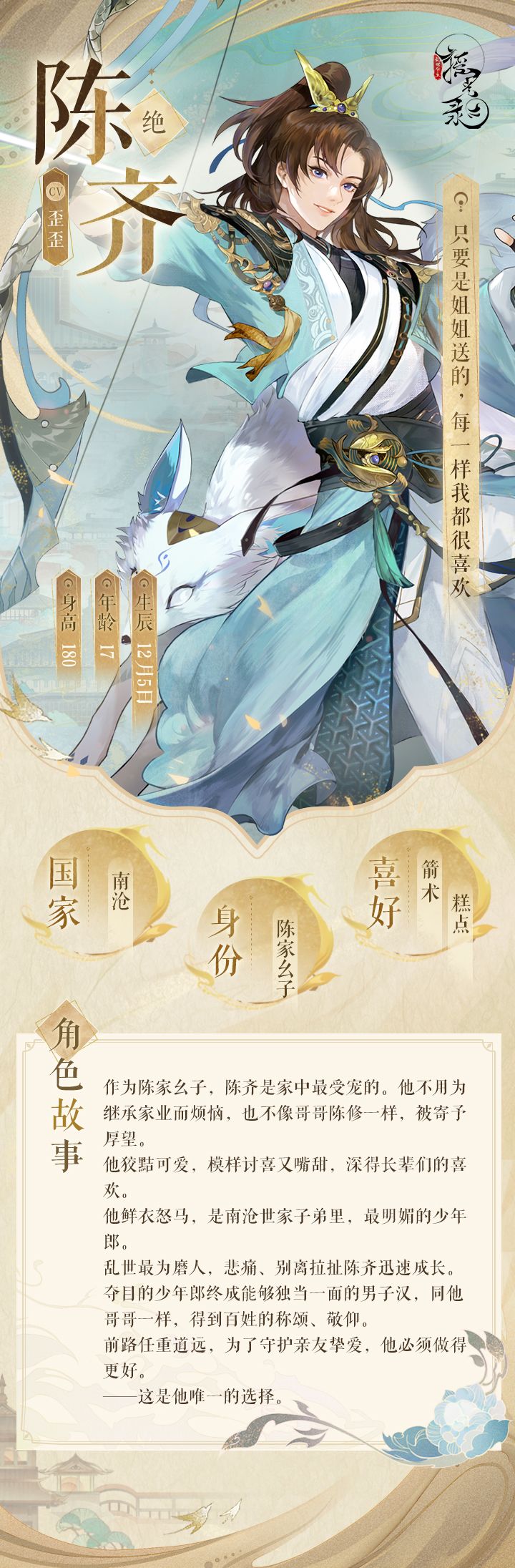 「我哪里都不去,我愿生生世世,做公主的臣。」 蛟龙出海,少年时可窥陈家儿郎统领之相。 身为陈家枪继承者,心如坚盾,自有凌云志。 名士陈修故事长图奉上,请公主阅之。 >>>全新官网正式上线,点击解锁豪礼,试听更多名士语音: >>>TapTap预约: