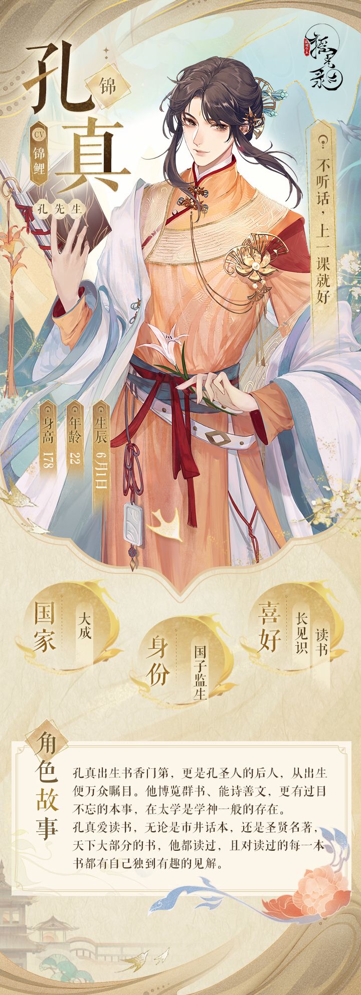 「不听话,上一课就好。」 真乃圣人之后,事以典故为据。平生酷爱读书,素来能诗善文。 过目不忘人称太学学神,千里游历行路心怀天下。 名士孔真故事长图奉上,请公主阅之。 >>>全新官网正式上线,点击解锁豪礼,试听更多名士语音: >>>TapTap预约: