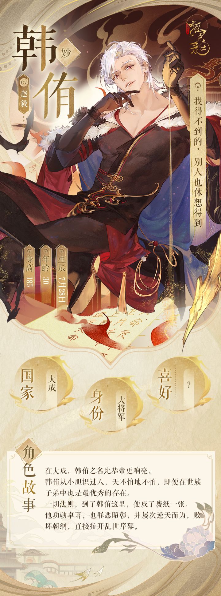 「我得不到的,别人也休想得到。」 一战成名无败绩,威风赫赫人上人。 离经叛道是他的人生注解,但无论战场还是朝堂,他都是无一例外的胜者。 名士韩侑故事长图奉上,请公主阅之。 >>>全新官网正式上线,点击解锁豪礼,试听更多名士语音: >>>TapTap预约: