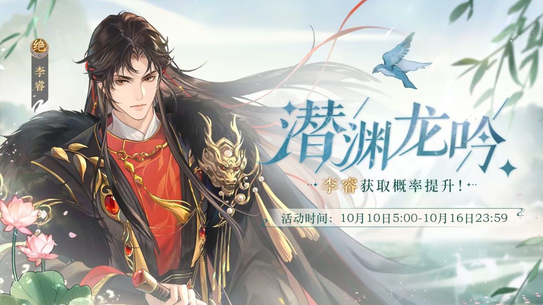 >活动时间:10月10日5:00-10月16日23:59 >活动简介:活动期间将开启轮替提升卡池【潜渊龙吟】,卡池中「绝品」名士「李睿」获得概率将大幅提升。 *结交活动期间及活动结束后,「绝品」名士「李睿」仍可继续通过常驻结交卡池【倾盖如故】获取。 >活动介绍: 1.【潜渊龙吟】卡池结交1次需消耗1个「兰台帖」,可通过玲珑阁购买。 2.【潜渊龙吟】结交活动持续时间内「绝品」名士「李睿」结交成功率大