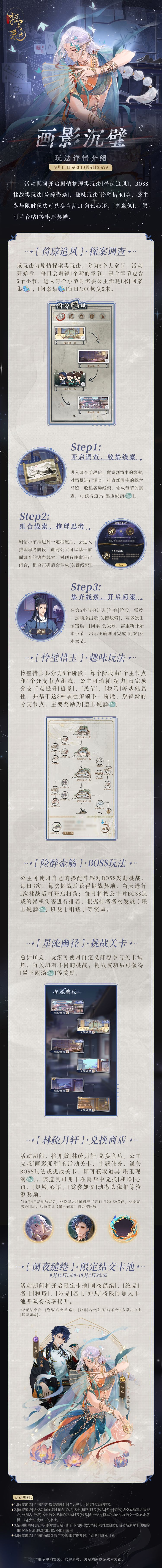 ♦活动时间:9月14日5:00-10月4日23:59 ♦兑换商店截至时间:10月11日23:59 ♦活动简介:收集线索,推理博弈,和名士一同开启调查,推理案件背后的真相。活动期间开启剧情推理玩法[倚琼追风],boss挑战玩法[险醉壶殇],趣味玩法[怜璧惜玉]等,玩家参与限时玩法可兑换当期UP角色心语、[青鸾佩]、[限时兰台帖]等丰厚奖励。 *【画影沉璧玩法详情】及【阑夜缱绻】卡池规则,请公主点