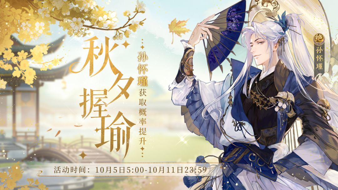> 活动时间:10月5日5:00-10月11日23:59 > 活动简介:活动期间将开启轮替提升卡池【秋夕握瑜】,卡池中「绝品」名士「孙怀瑾」获得概率将大幅提升。 *结交活动期间及活动结束后,「绝品」名士「孙怀瑾」仍可继续通过常驻结交卡池【倾盖如故】获取。 > 活动介绍: 1.【秋夕握瑜】卡池结交1次需消耗1个「兰台帖」,可在玲珑阁购买。 2.【秋夕握瑜】结交活动持续时间内,「绝品」名士「孙怀瑾」结