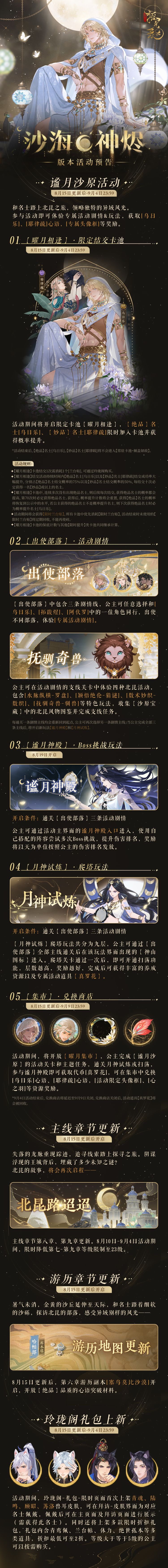 烈日炽炎,黄沙漫天。步入北昆,与他共同踏上异域旅程,穿越沙漠的辽阔,探寻隐藏在北昆中的未知之谜。 ◆谧月沙原限时活动 开放时间:8月15日更新后-9月4日23:59 兑换商店截止时间:9月9日23:59 活动概要:和名士踏上北昆之旅,领略独特的异域风光。参与活动即可体验专属活动剧情&玩法,获取[乌日乐]、[耶律疏]心语,[专属头像框]等奖励。 ◆主线章节更新 8月15日更新后,主线章节第八章、第九