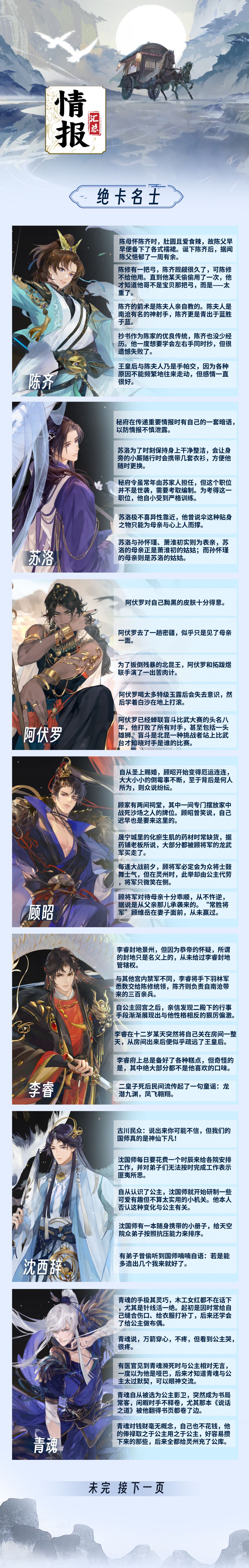 公主殿下日安,奉上全名士的情报汇总! 名士情报可通过【封邑】界面的【天机渡】探索获得,获得的情报可在【封邑】界面的【星罗舫】中查看,重复获得的名士情报会自动转化成800情报,转化的情报可用于升级封邑商店或在【玲珑阁】兑换界面中的【情报】处兑换奖励。 说明:本期汇总完全按照游戏内文案【原文】整理,如有错别字或语病请找官方捉虫#攻略#游戏攻略#国产游戏