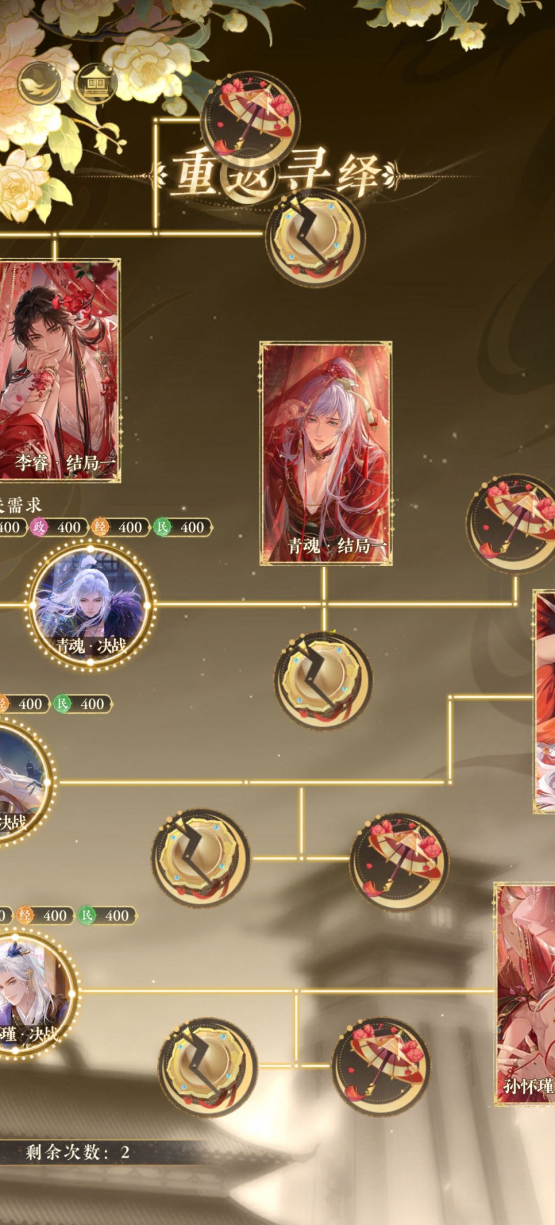 结局一达成条件:通过关卡,倾慕值>900 结局二达成条件:通过关卡,900>倾慕值>500 结局三达成条件:不通过关卡 攻略思路:这次相比上次活动容易了很多,也做了很多调整改动,同样的第一天都要刷4主卡(孙和青哥),刷卡的时候不要舍不得升级材料,这次的升级材料绝对够用,可以蓝卡紫卡或者别的金卡升级,来辅助我们第一天通关获得更多回合数刷主卡,当然如果一个回合就刷出来4个主卡就不用给别的升级了,主升这