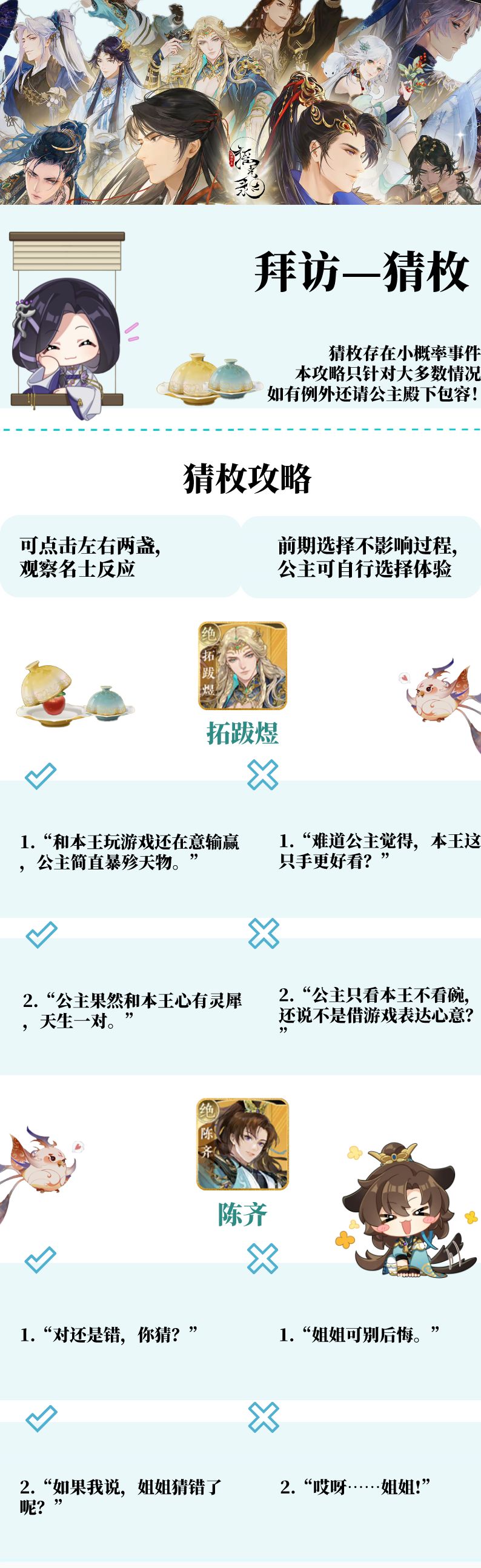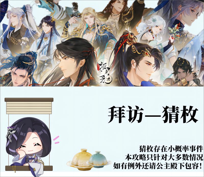 公主殿下日安,奉上2023.10.30已公布的绝品名士的猜枚攻略(已更新至千金裘)。 可点击拜访页面的【猜枚】进入游戏,猜枚游戏暂时只能与绝品名士游玩。 每天可进行3次猜枚,一位名士每天只能猜1次,猜枚需要消耗猜枚券*1,猜枚券可通过活动和封邑商店兑换获得。 猜枚成功后可获得名士记忆*1并进入一段剧情,猜枚失败可获得名士好感度*200。 小科普:猜枚,是中国民间饮酒时一种助兴取乐的游戏。多用为酒令