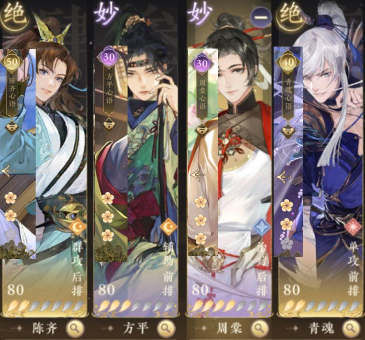 此为纯暴力输出阵容,没啥功能性 先上结论:方平➕前排t➕群体输出➕单体输出 紫卡主要是比较好抽到心语,官方也送了很多自选,比较容易养,但是数值肯定是没金卡高的,有金卡就用金卡。 图片是最低配置 方平个人觉得不可替代,因为他被动效果可以让攻击力力最高的人连续放两次技能,群攻输出连续放两次aoe推图特别快 容凛可以换成顾昭或者青魂都可以,个人推荐顾昭 陈修可以练到50级,后面换成陈齐或者二哥(建议搭配