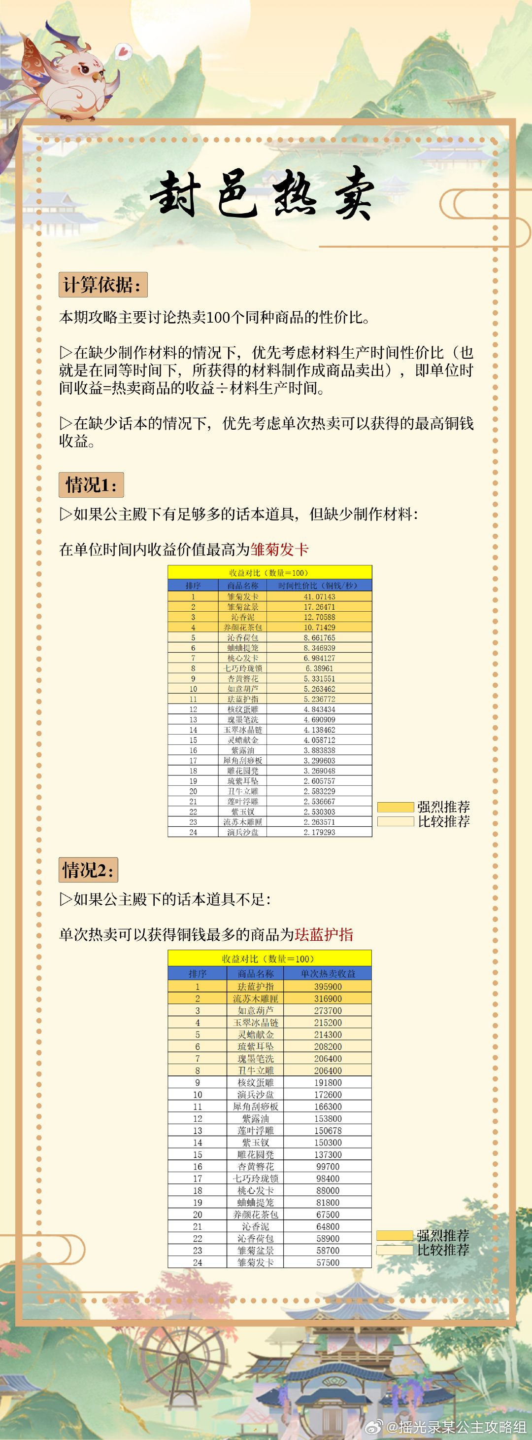 公主殿下如果缺少铜钱,可以在封邑进行热卖获得大量铜钱。 〈在妙仪坊做好东西之后去万象城上架,点击下方整组上架,点击热卖获得收益〉 ▷省流总结版:建议做【雏菊发卡】。所需材料产出时间成本最低,性价比最高。注意!需要消耗大量话本!(如果话本道具不多,可以根据自身情况选择价值较高的商品,以达到通过较少的热卖次数获得大量铜钱的目的。ps:单次热卖【珐蓝护指】所获得的铜钱最多。) ▷小技巧: 1.制作不用一
