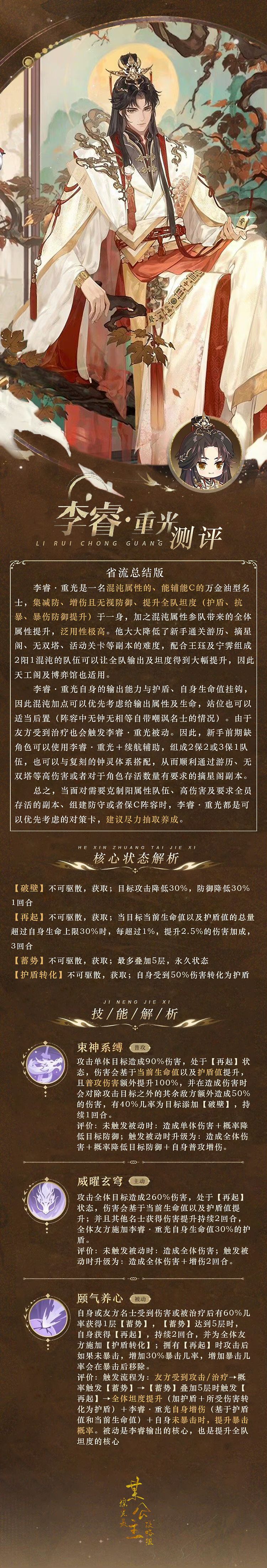 公主殿下日安,奉上李睿·重光测评。完整文字内容详见长图~ ▷省流总结版 李睿·重光是一名混沌属性的、能辅能C的万金油型名士,集减防、增伤且无视防御、提升全队坦度(护盾、抗暴、暴伤防御提升)于一身,加之混沌属性参队带来的全体属性提升,泛用性极高。他大大降低了新手通关游历、摘星阁、无双塔、活动关卡等副本的难度,配合王珏及宁霁组成2阳1混沌的队伍可以让全队输出及坦度得到大幅提升,因此天工阁及博弈馆也适