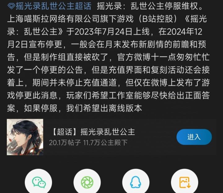 有说项目组被砍的,虽然不知道是不是真的(毕竟制作组都没了的游戏真的会凉)反正就一整个迷茫还挺良心的游戏,转眼就要关服这个确实不伤肝感觉小厂游戏真的没啥活路吧(还有微博那些庆祝摇光录倒闭的,真是够了,感觉他们像自己游戏的黑子,鉴定为新形式商战,给自己游戏招黑)(如果实在不行就祈祷它出离线版吧)各位晚安,祝大家做个好梦(๑°3°๑)