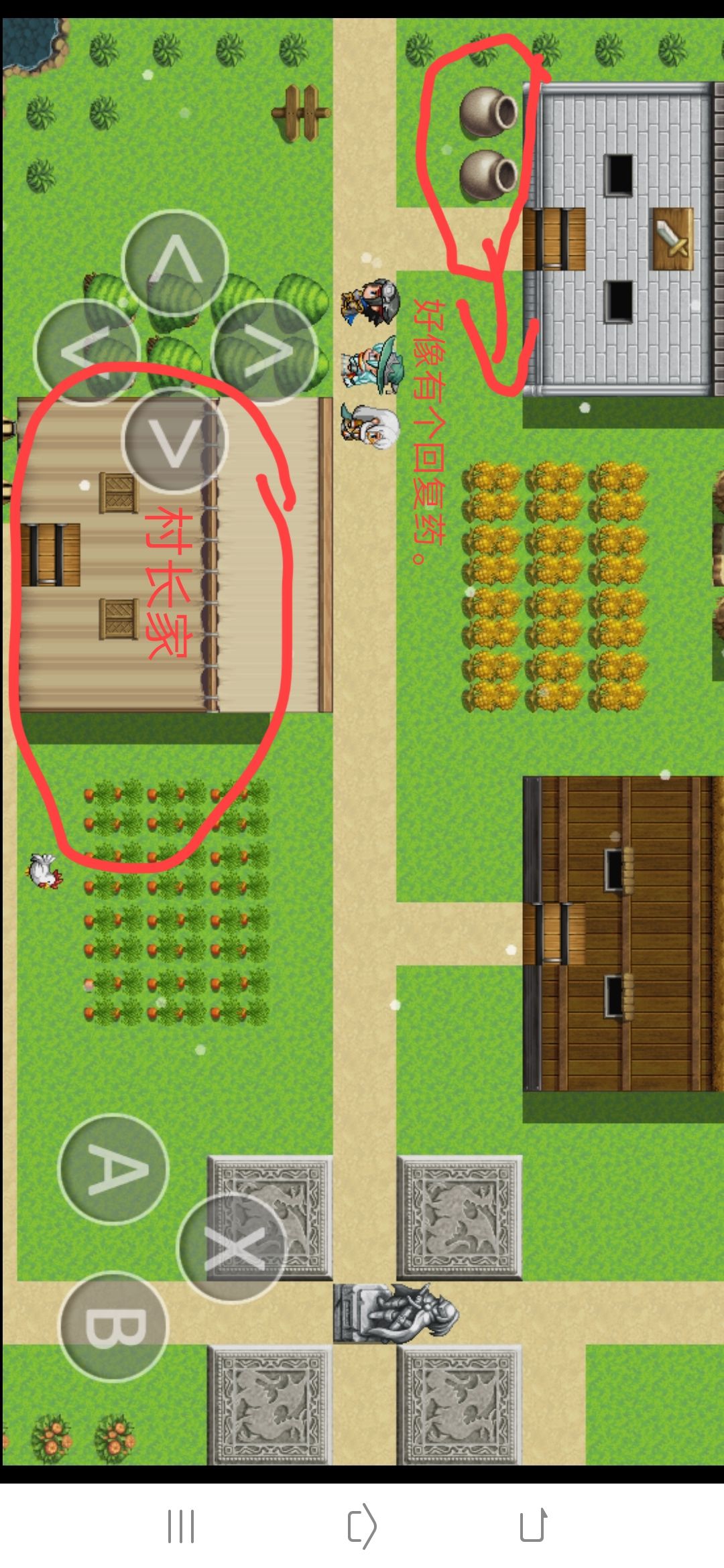 第一次写攻略请多多关照,谢谢。有遗漏的请原谅。我能记得的就写一下,记不得的我就不写了,谢谢。 注意!注意!注意!《游戏里宝箱开到的装备别卖!别卖!别卖!后面会用到》 开始!可以跳过剧情《看个人》,主角和妹子对话完了后,妹子就带着主角带到村子里,主角这时候就可以活动了,先去村长家如图: 和村长对话他会给你100G.然后到旅店,旅店里面有一个宝箱如图: 然后就可以快乐的堵小鸡了。堵小鸡我自己总结了三处