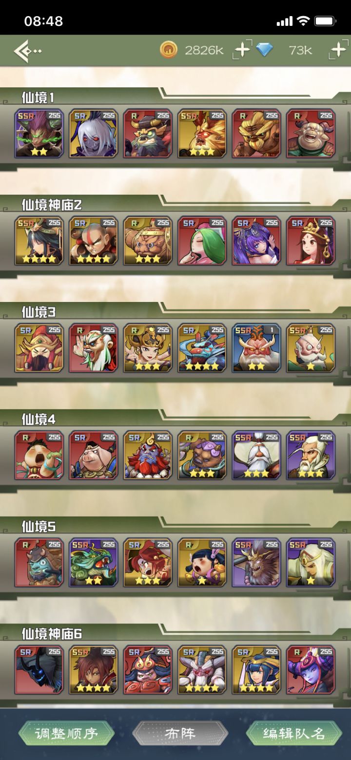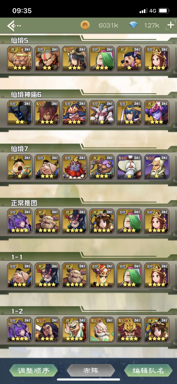 二队:橙二孙悟空(紫二,体力洗练!)橙二杨戬(紫二)橙二龙三(紫三)紫二太白金星(蓝二)橙二阎罗王(紫一)橙二女儿国王(蓝色)