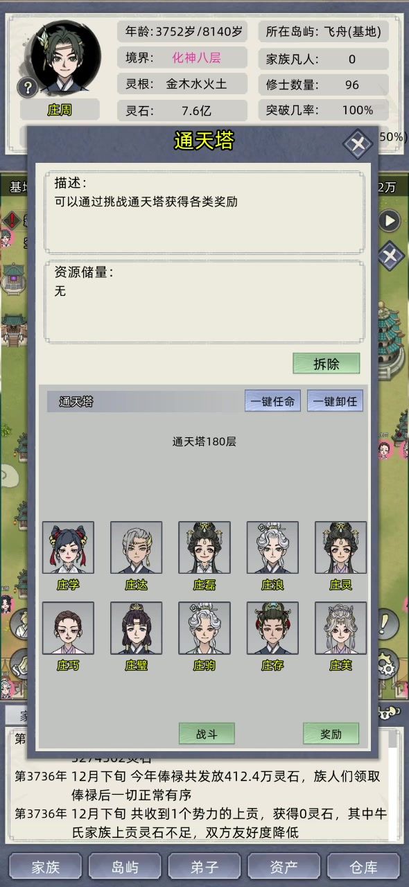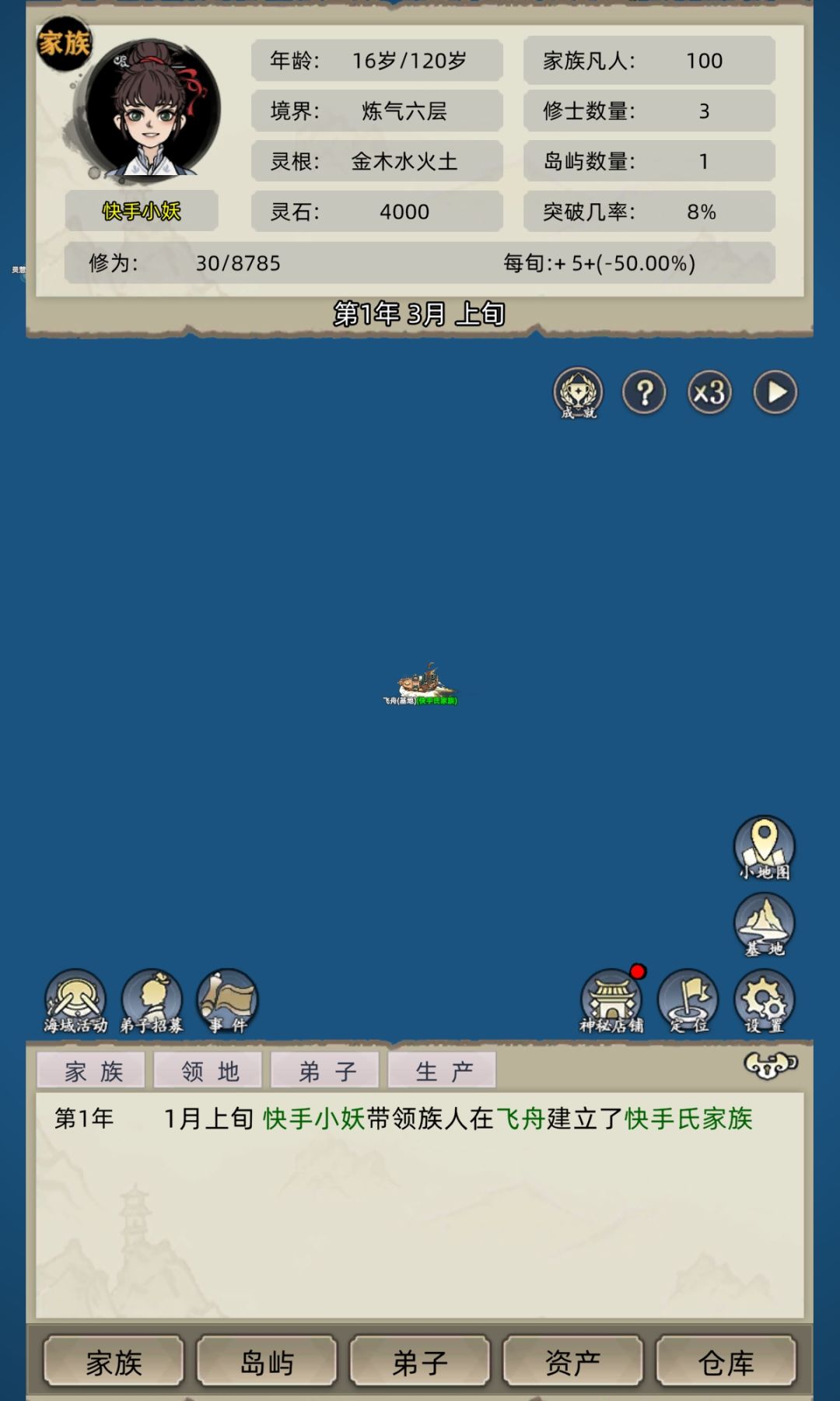 家族模式 30功德开局,无广告无SL。开局之前自由模式拿2000功德。老祖一千多岁了还是金丹,她的第六代后人两百多岁突破化神期,从此开启复兴之路。(选女主拿男弟子,男主拿女弟子。推荐女主) 分享小技巧,有些玩家可能总是被海兽困扰,分享小技巧,开局选长老,一个长老带上2级的垃圾装去欺负筑基及以下的岛屿,先右边方向,一路掠夺到最右边,再回家,往左边掠夺(尽量打邪派,少量的打点正派)。基本上打到地图左边