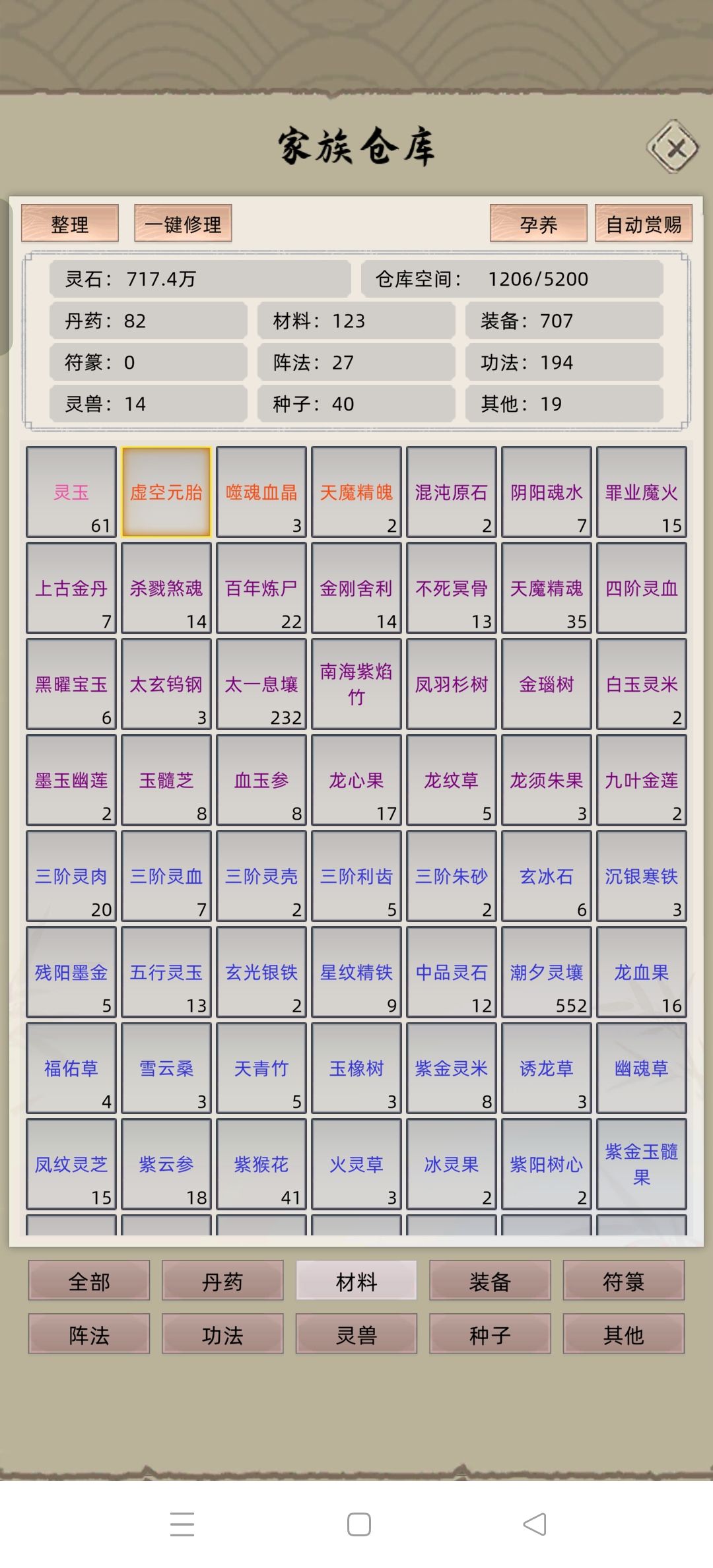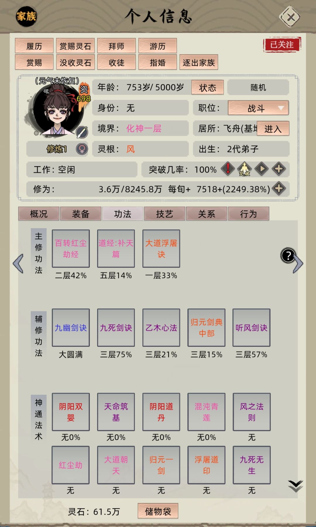 通天飞舟必选,老祖不用带天赋,就用以前那个签到礼包获得体质天赋,我老祖资质最高551,再用丹刷就覆盖原有天赋了。 飞舟跑全图收集修为丹药,老祖突破很快的,前期功法收集万木通灵+四阶剑诀,然后说下加防御数值的功法有bug,我金丹老祖用日月长空打对面金丹,+那三万多防当纸糊一样,对面没减防的功法,一两万的攻,打我血几万几万的掉,金丹阶段最有用的功法应该是万木通灵,带几本剑诀,可以尝试打八级家族,能打