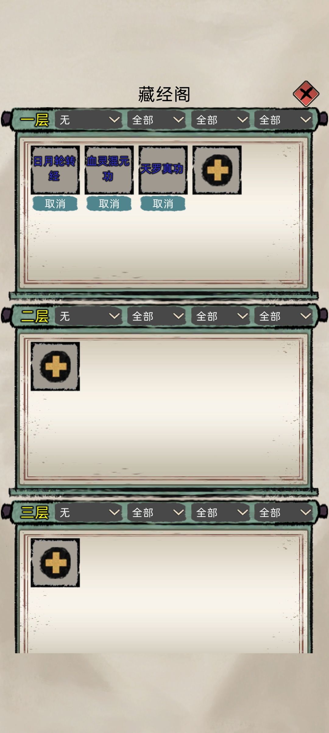 我自己用着藏经阁太难受了,本来就只想让他学那本功法的,到没别的功法可学就去学工具人技艺功法,但他只会按藏金阁排的顺序去学,[表情_惊恐]这功能很难搞啊!藏金阁没办法满足所有人物不同技艺的需求以及一阶二阶不同阶层功法的优先级的排序功能。 所以作者可以在人物的辅助功法栏这里直接让我们预选好要学的功法的功能,让他可以按着排好顺序的功法去自动修炼,反正前期很多功法就是为了技能和辅助作用,遗忘后技能还在#修