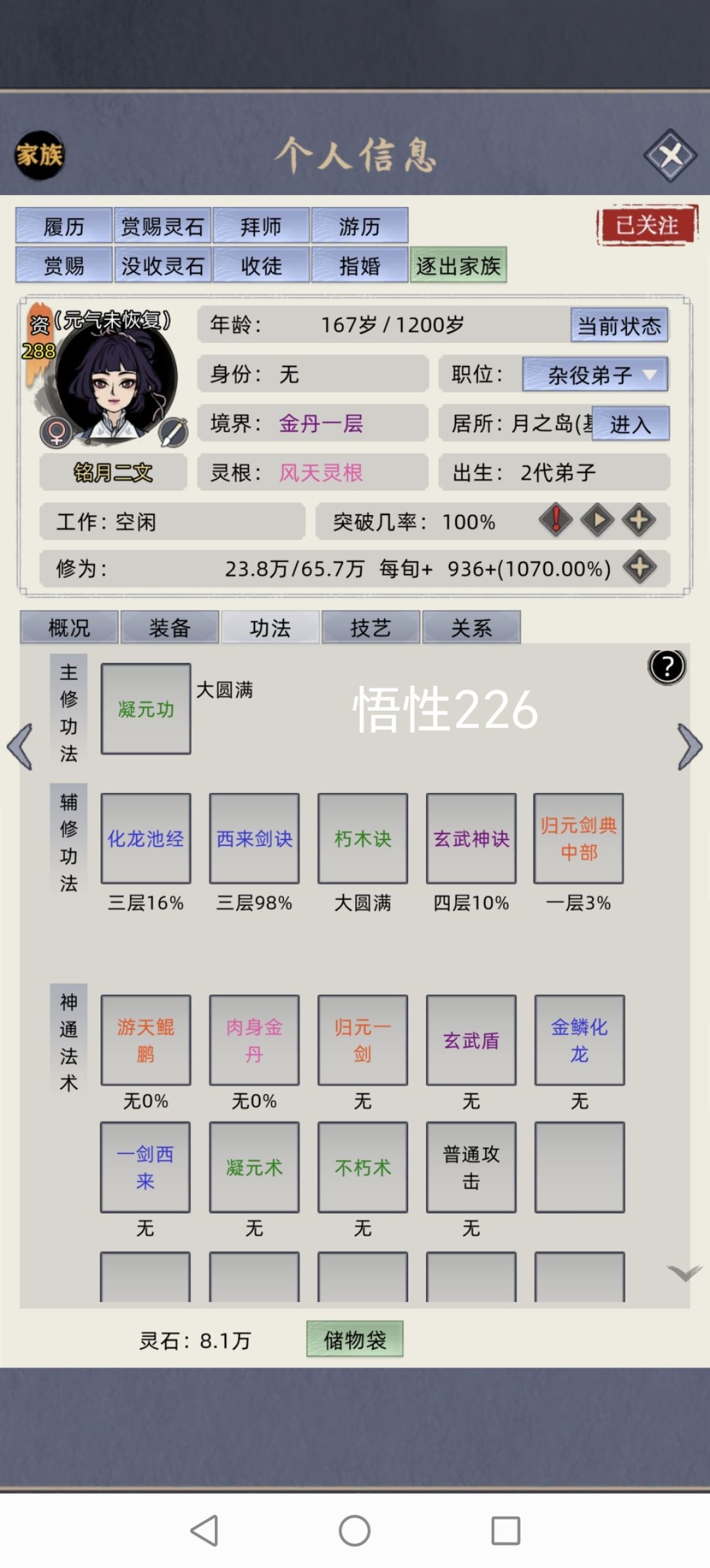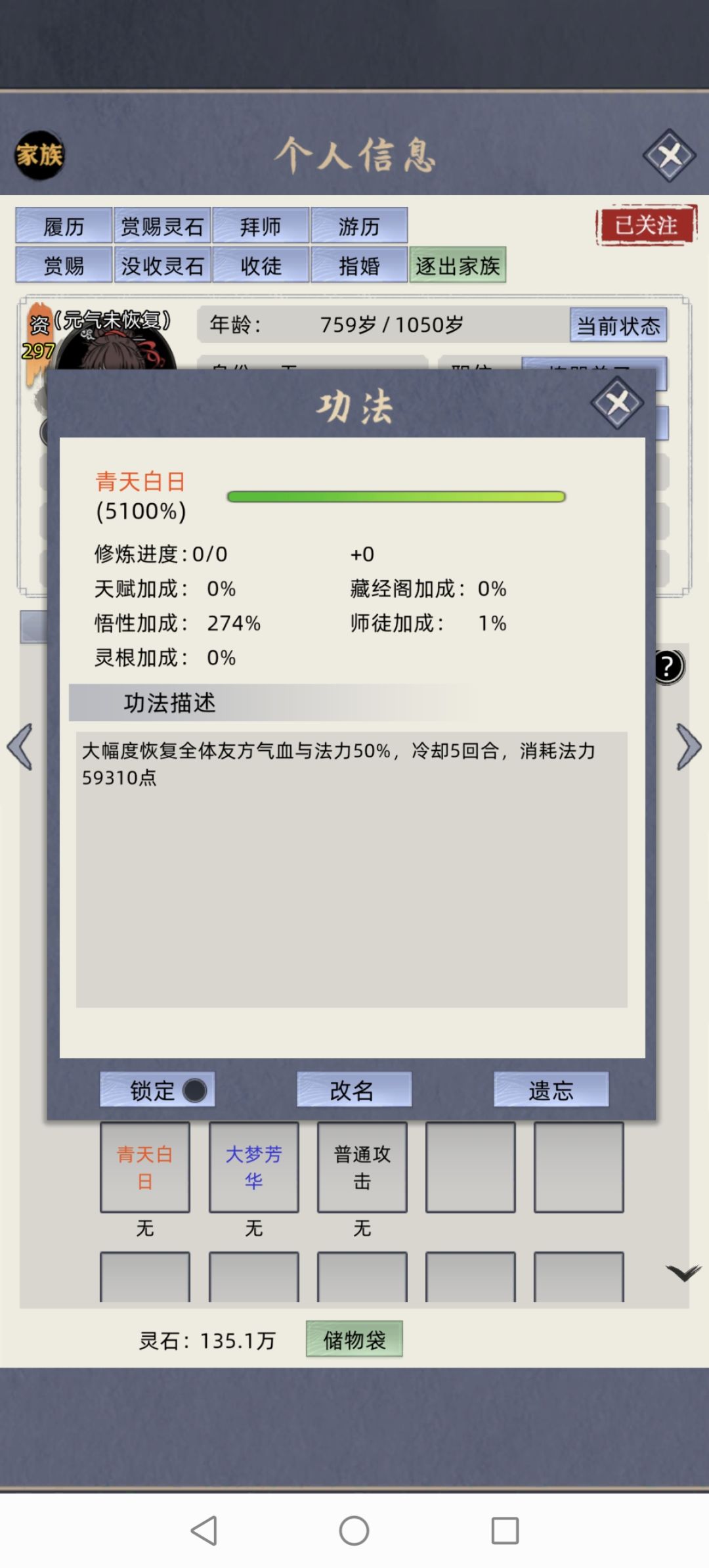 看图看图,好几张呢。 三四五灵根的,学归元功。(最好的) 或者自动赏赐颗筑基丹。(没有道心十以上,修炼的慢的大概率死) 乙木花开,蓝耗一万多。只要没装备,学了乙木花开紫府突破金丹的雷劫必死。有装备雷劫不破防可以慢慢a。 天青、太阿圣法。最好晚点学。 给有四阶饰品的学,或者到元婴期。 蓝耗太高了。 没装备小人就六七万蓝,一个技能消耗五万九。 蓝条够了,(功法修炼圆满后小人自动用能学习的高阶功法替换低