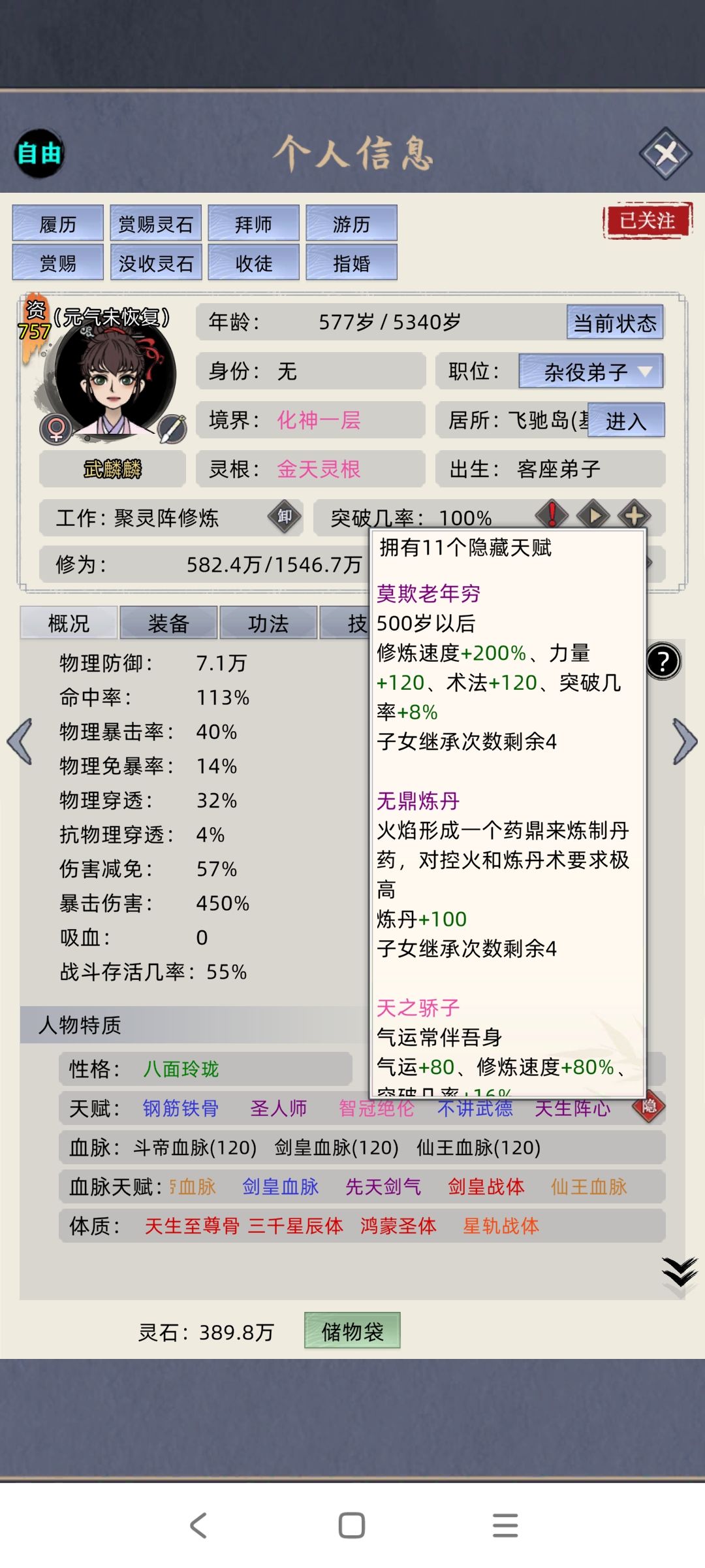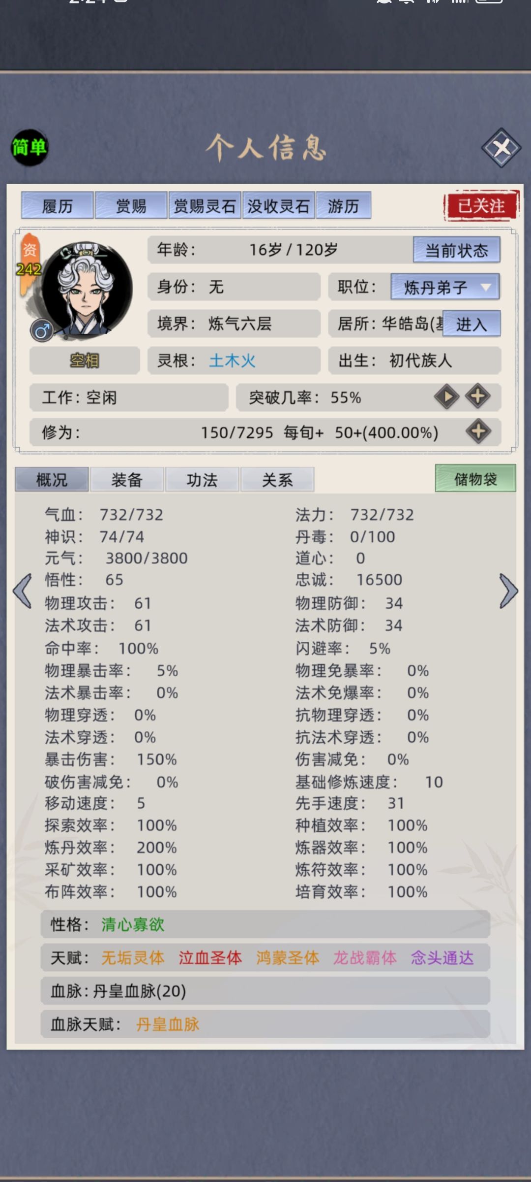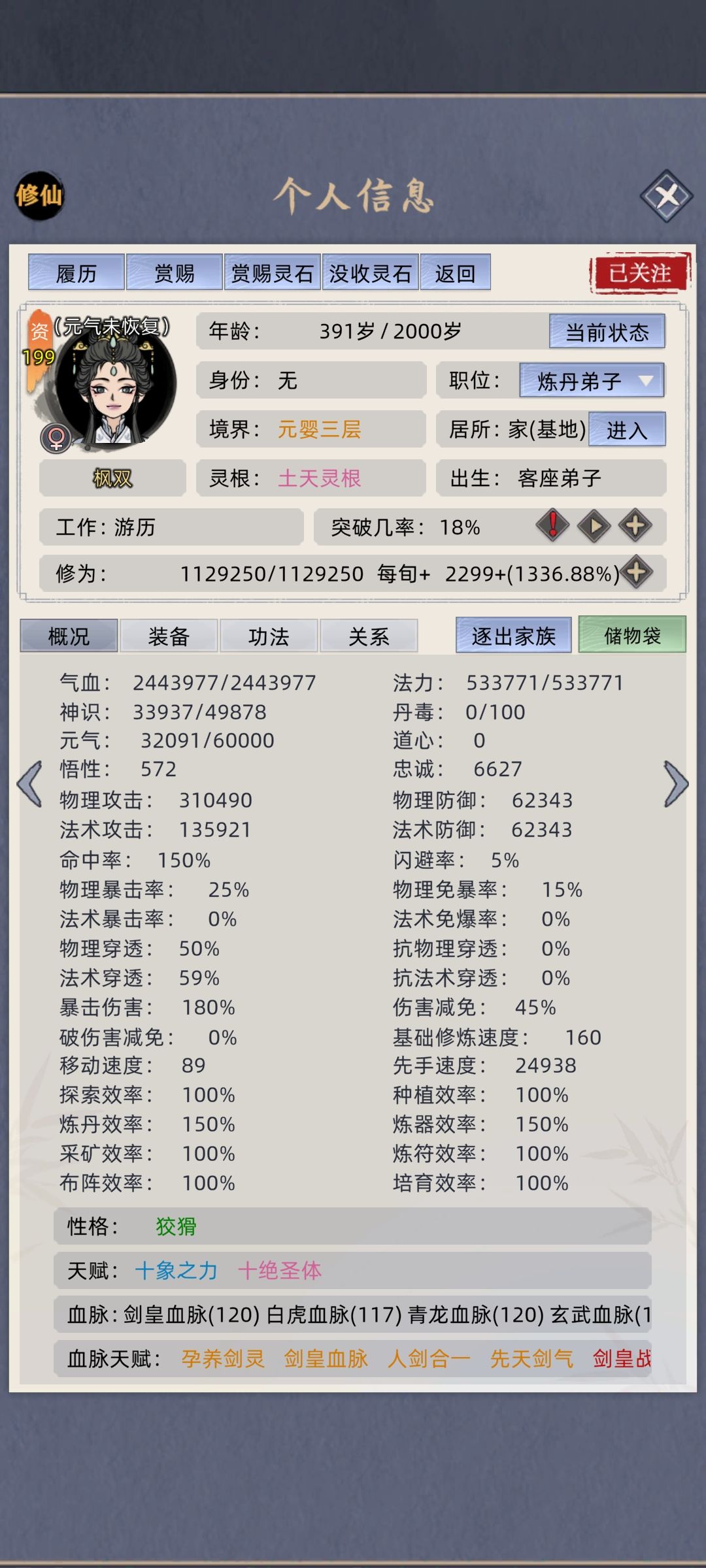 【第一节:开局选择】 ①,血脉浓度继承拉到最高 ②,开启名人可抓取 ③,天赋继承概率拉满 ④,开局其他势力境界拉到筑基 ⑤,天赋继承次数最好不要选5倍,3倍差不多 ⑥,太上长老,升仙台,登仙台,悟道塔必选 ⑦,性格选仁者(没全测试其他性格),部分性格大爱仙尊和韩老魔会跑。 【第二节:开局事要】 ①,商店刷套装备给太上长老,订单里加上九龙草福佑草种子和九龙丹 ②,设置里关闭自动结婚,关闭自动存档,打