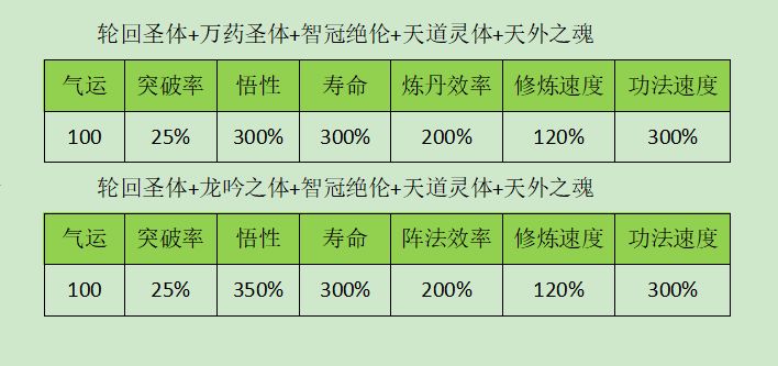 用PC版实验的,应该和手游差不多。 体质类 1.仙体-绝品道体丹 2.红体-极品道体丹✘3 不灭剑仙体 黄泉道体/万源佛体 金刚霸体/苍天霸体 3粉体-上品道体丹 龙战霸体 4.橙体-中品道体丹 不灭之体 5.紫体-下品道体丹✘2 (贼肛,经常刷到冲突天赋导致白吃丹药。) 自愈之体 长生体 ps:青莲剑体不知道咋搞,1号位体质也不知道咋搞。天道灵体和先天那个天赋冲突而且只能出身自带(没试过不知道丹