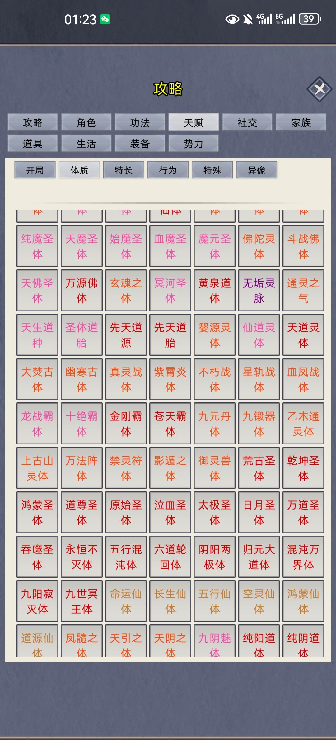 开局有些道友想选无垢,选这东西也不是不行,因为选了无垢随机橙容易出鸿蒙圣体,我大概看了一下,开局随机橙在有无垢的情况下应该有六分之一或者五分之一概率出鸿蒙圣体(应该是无垢冲突掉了老牌修炼天赋,剩下的就是剑体佛体魔体生产体和一些杂七杂八天赋)。 因此就有了一种新手或懒鬼的快速突破选择就是随机红粉橙加无垢,搞到鸿蒙之后就可以按前一个贴的方法天道台买天赋丹和换灵丹刷灵根和六天赋了。(这段没啥用)关于部