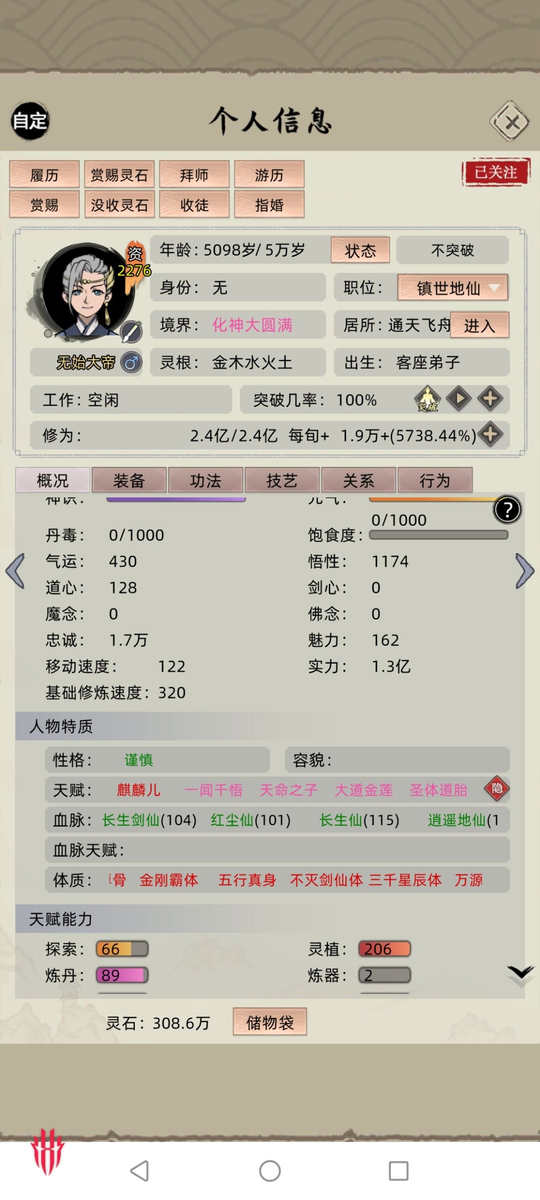 【第一节:开局选择】 ①,血脉浓度继承拉到最高 ②,开启名人可抓取 ③,天赋继承概率拉满 ④,开局其他势力境界拉到筑基 ⑤,天赋继承次数最好不要选5倍,3倍差不多 ⑥,太上长老,升仙台,登仙台,悟道塔必选 ⑦,性格选仁者(没全测试其他性格),部分性格大爱仙尊和韩老魔会跑。 【第二节:开局事要】 ①,商店刷套装备给太上长老,订单里加上九龙草福佑草种子和九龙丹 ②,设置里关闭自动结婚,关闭自动存档,打