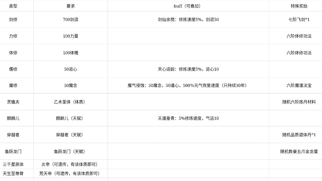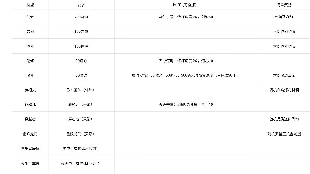 省流(下图自取) ps:若同时满足多项条件,将随机一个飞升剧情 1.剑修 前置条件:700剑道(纯剑修) 特殊奖励:七阶飞剑*1 buff 剑仙余荫:修炼速度5%,剑道50 文案 不堕轮回入大千,心传一道在人间。愿起一剑杀万劫,无情换作有情天! 2.体修/力修 前置条件:100体质/100力量 buff:无 文案 举手撑天岳,足量九地宽。含烟定四海,吐气动万山! 特殊奖励:六阶体修功法 3.魔修 前