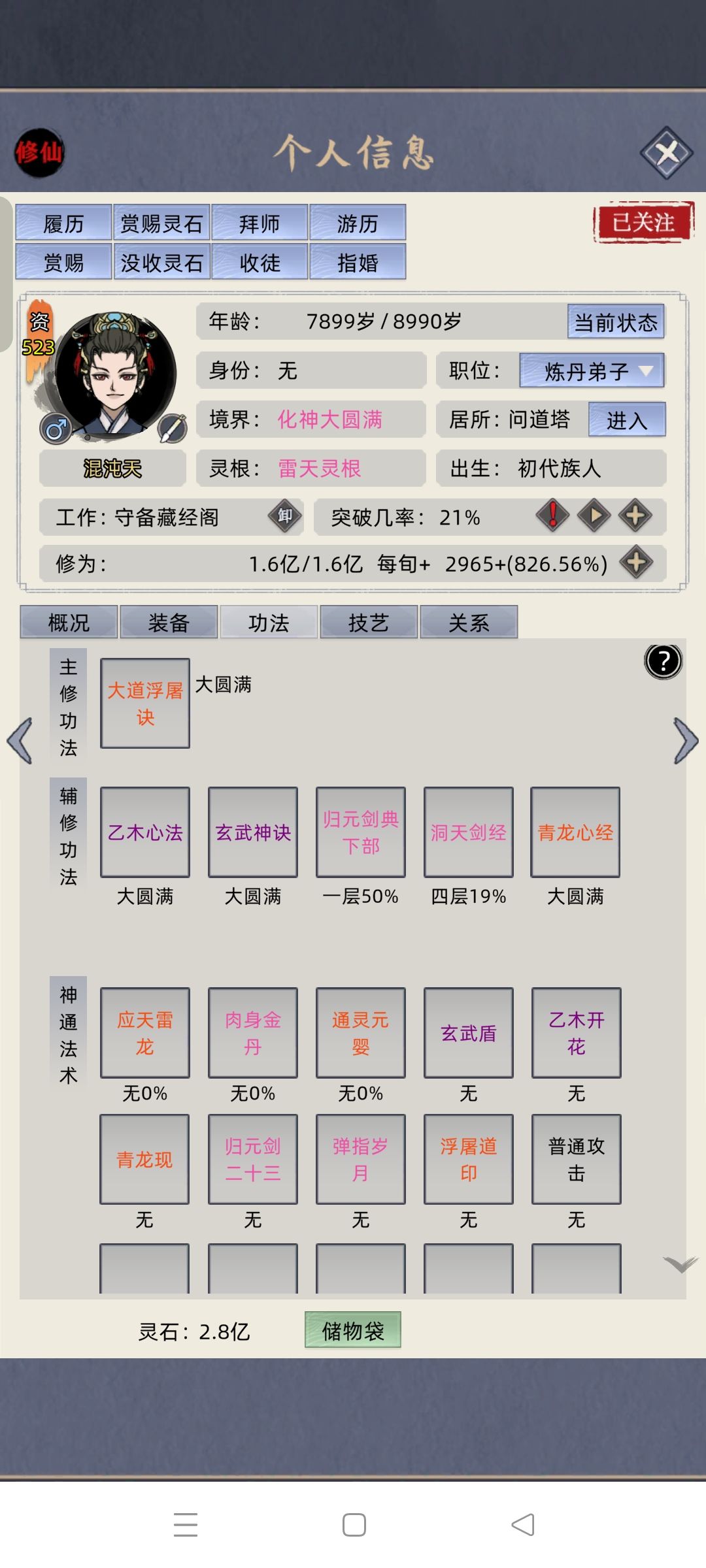 如图,无装备、无天赋、77资质化神,低配功法成功渡飞升劫