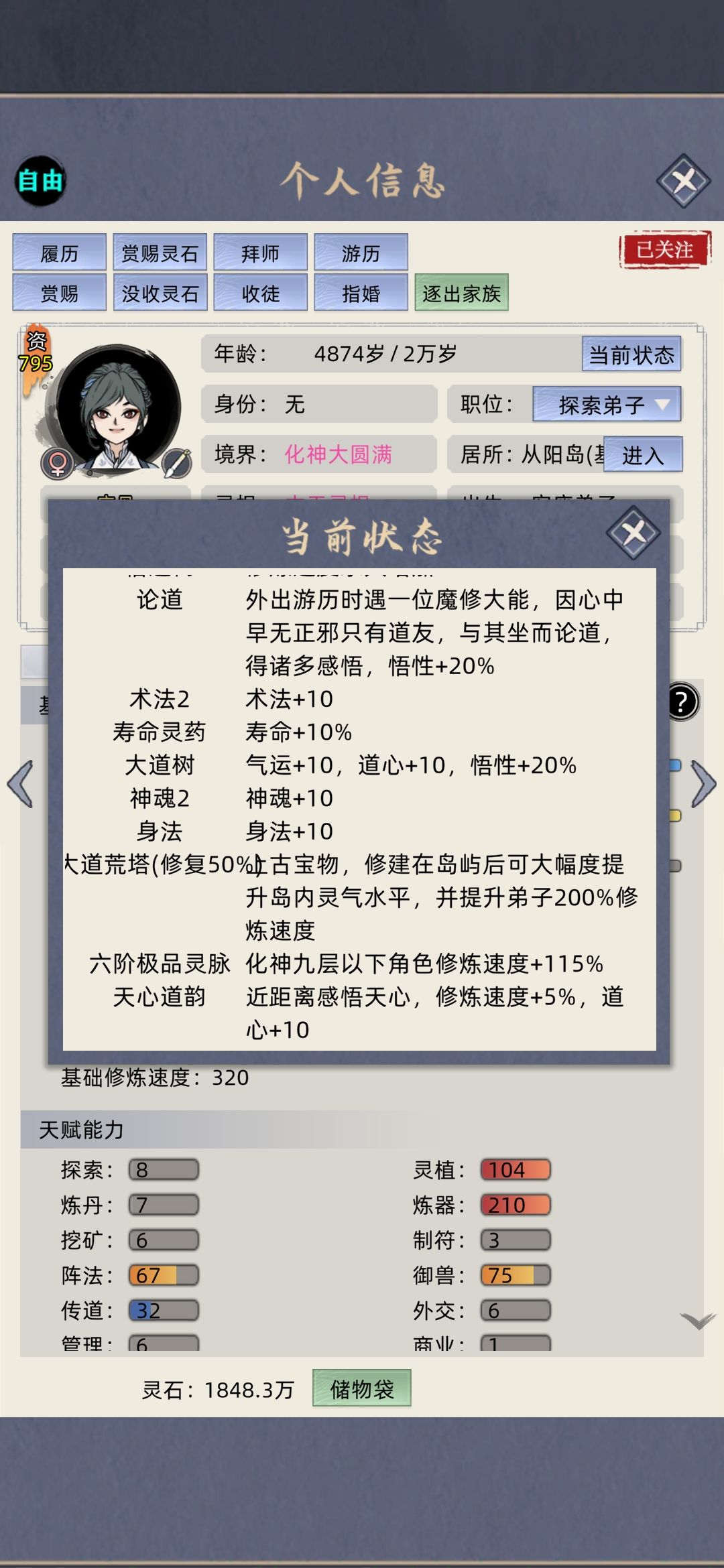 “老祖,5千年将至,是时候举行飞升大典了。” 新版本名人不会主动突破炼虚,都中了-120%突破率 所以这版本助力名人飞升很容易 宝物带,问道塔(初始大爱飞升失败,估计要300资质才能飞升),登仙台 家族模式名人的遗传价值主要是红色体质,然后是放养偶尔抓来没收储物袋(名人储物袋资源很富)最后助力其飞升爆出灵玉,丹药图纸 补充一下抓名人的方式,找到名人的岛屿,查看家族等级,自己的家族等级必须比名人的