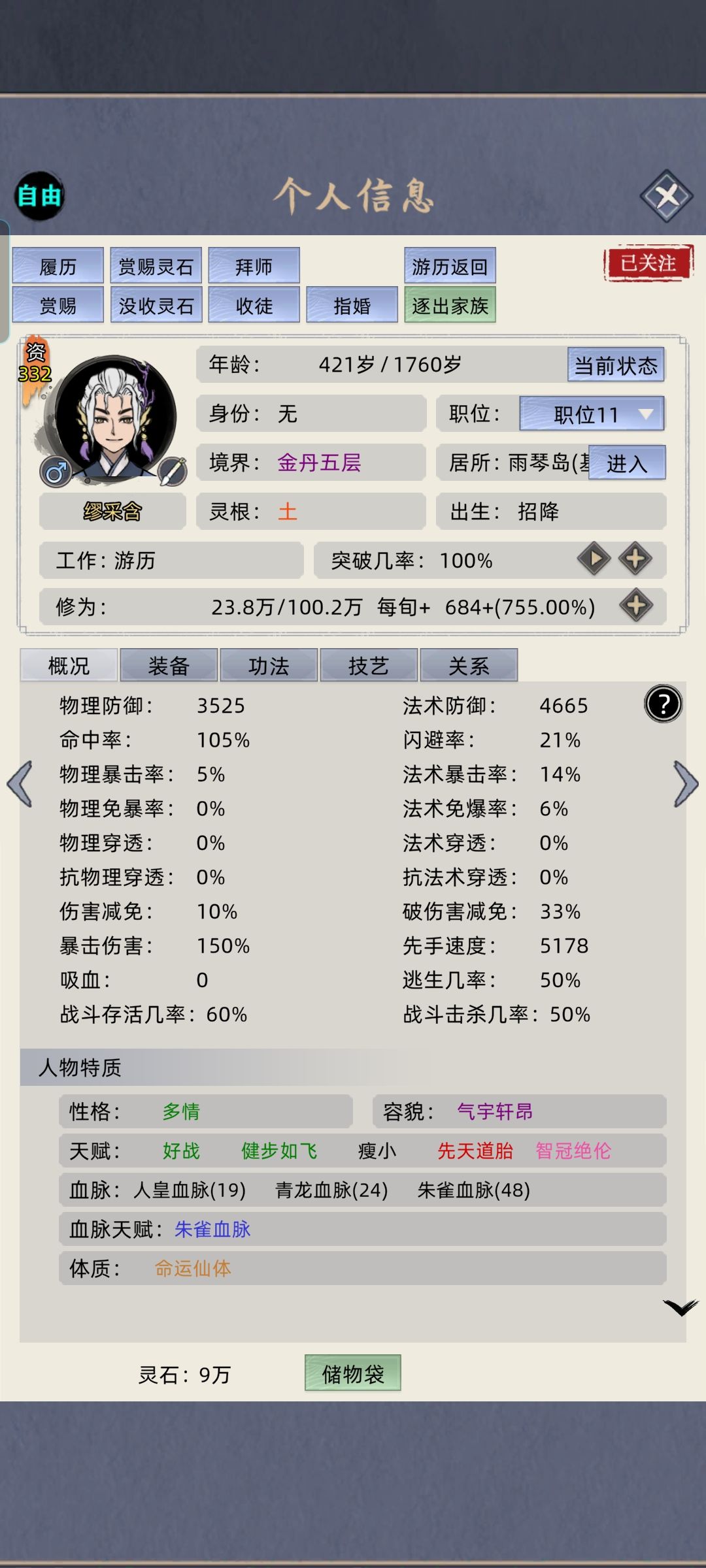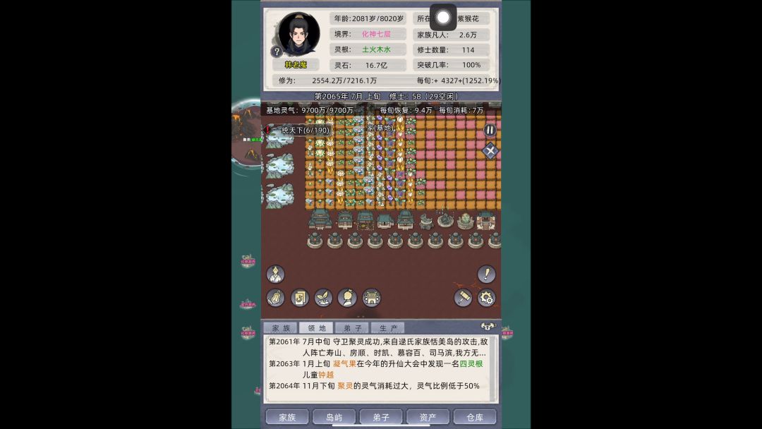 七岁金丹,四十化神,百岁炼虚,八百年便可成就大圆满,举世无敌,这就是仙苗! 配血脉需要不断回档的,不回档很难配。我这回档指的是手机本地文件回档,不是游戏里的暂停退出重进。 配血脉期间家族必最好全部一个性别或者已婚,放进来异性,18岁必给他配婚,否则你的高血脉种子被玷污了,就等着哭。 对了,还要准备一大堆男性单身汉,最好是元婴化神级别的;然后去地图上别的家族找到你合适的高血脉女弟子,你最好把这个家族