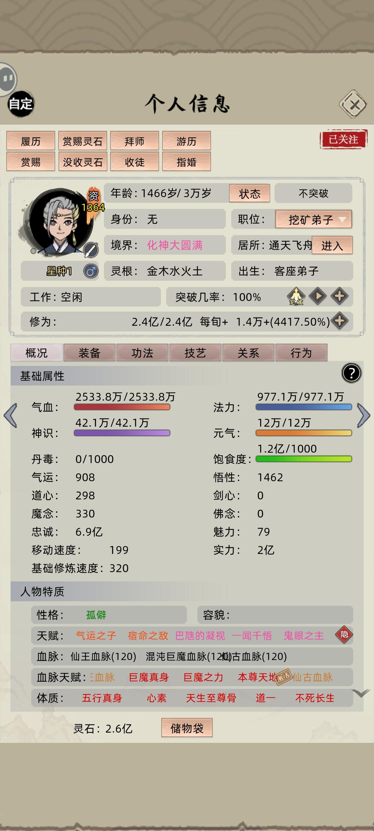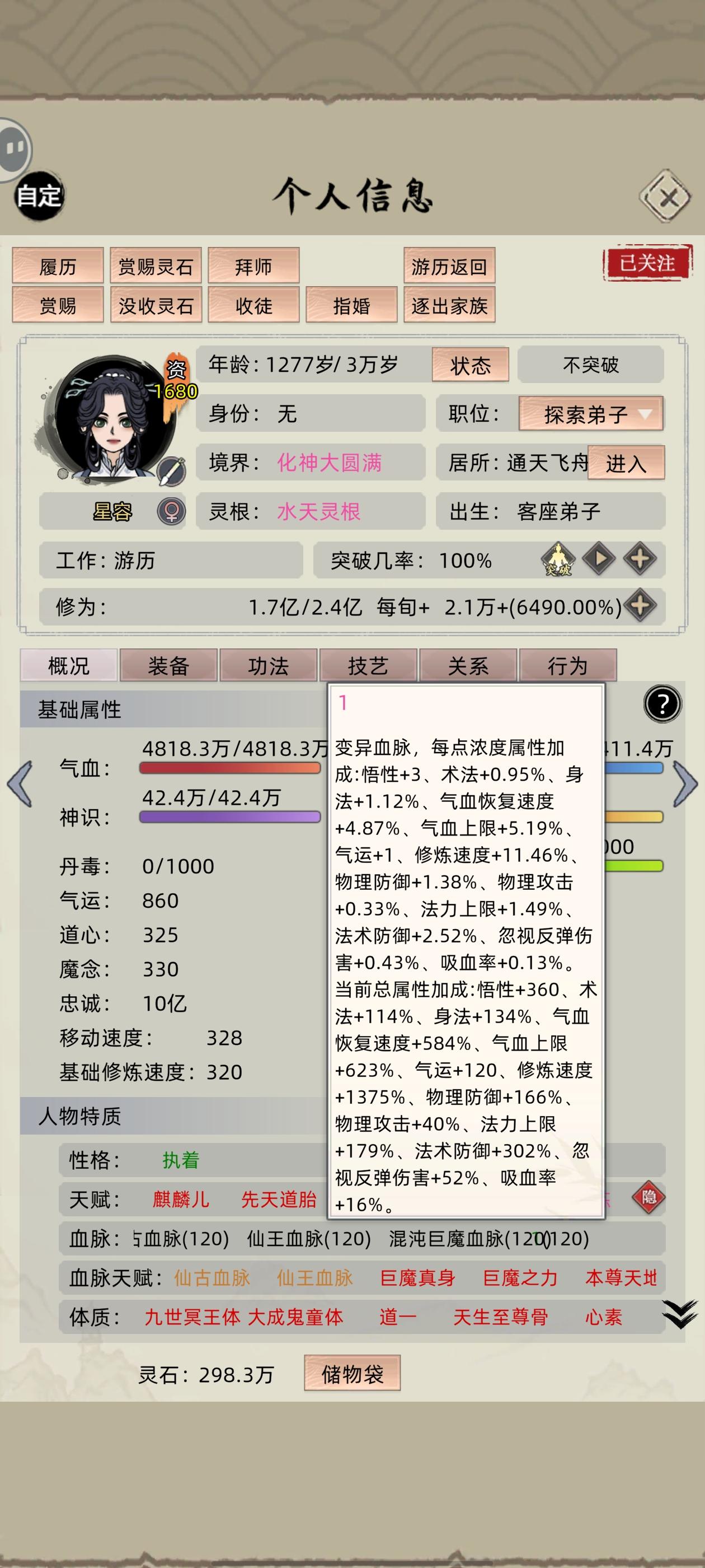 李青侯到手,血脉就收集完了,麒麟,巨魔,鲲鹏,3血脉收集完成。剩下的就是配体质了,不过也好配,毕竟全部名人都抓过来了。这个档很顺利,开局遇到朝夕问道花,直接老祖化神2了,100多年把全部名人都抓过来了。要不是升级升仙台没材料(拿仙道升仙令),耽误点时间,早配好了。算是最顺利的一个档。