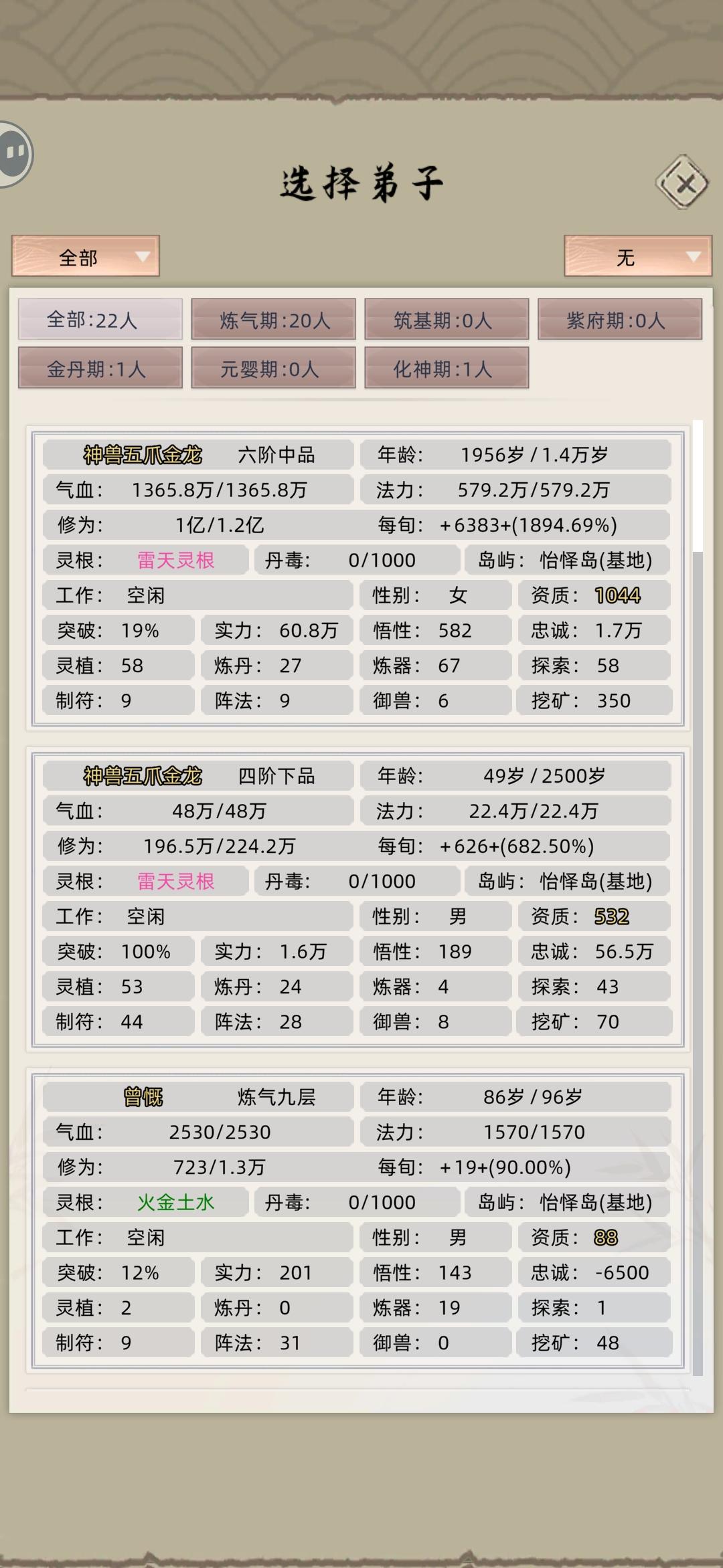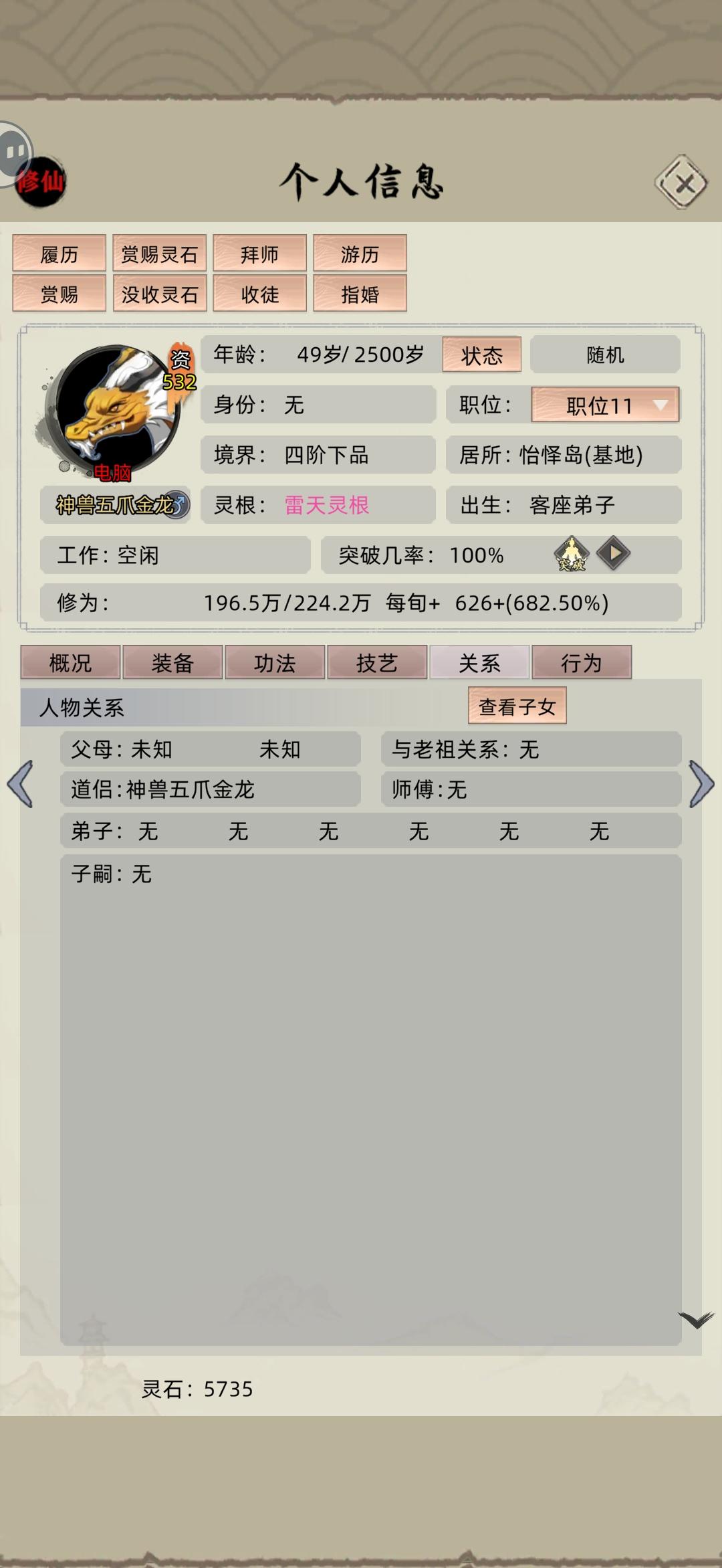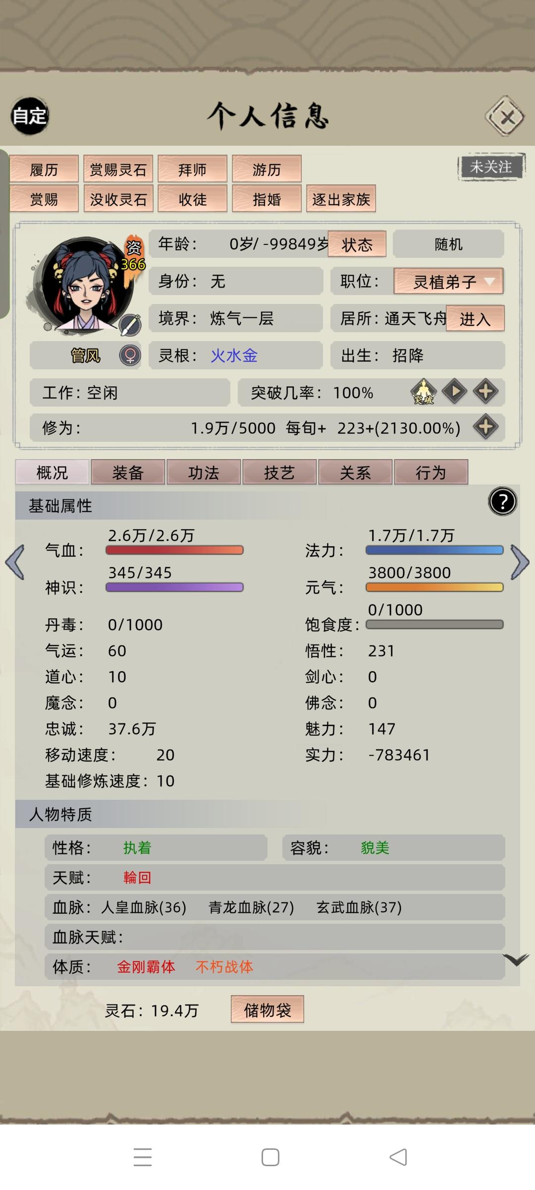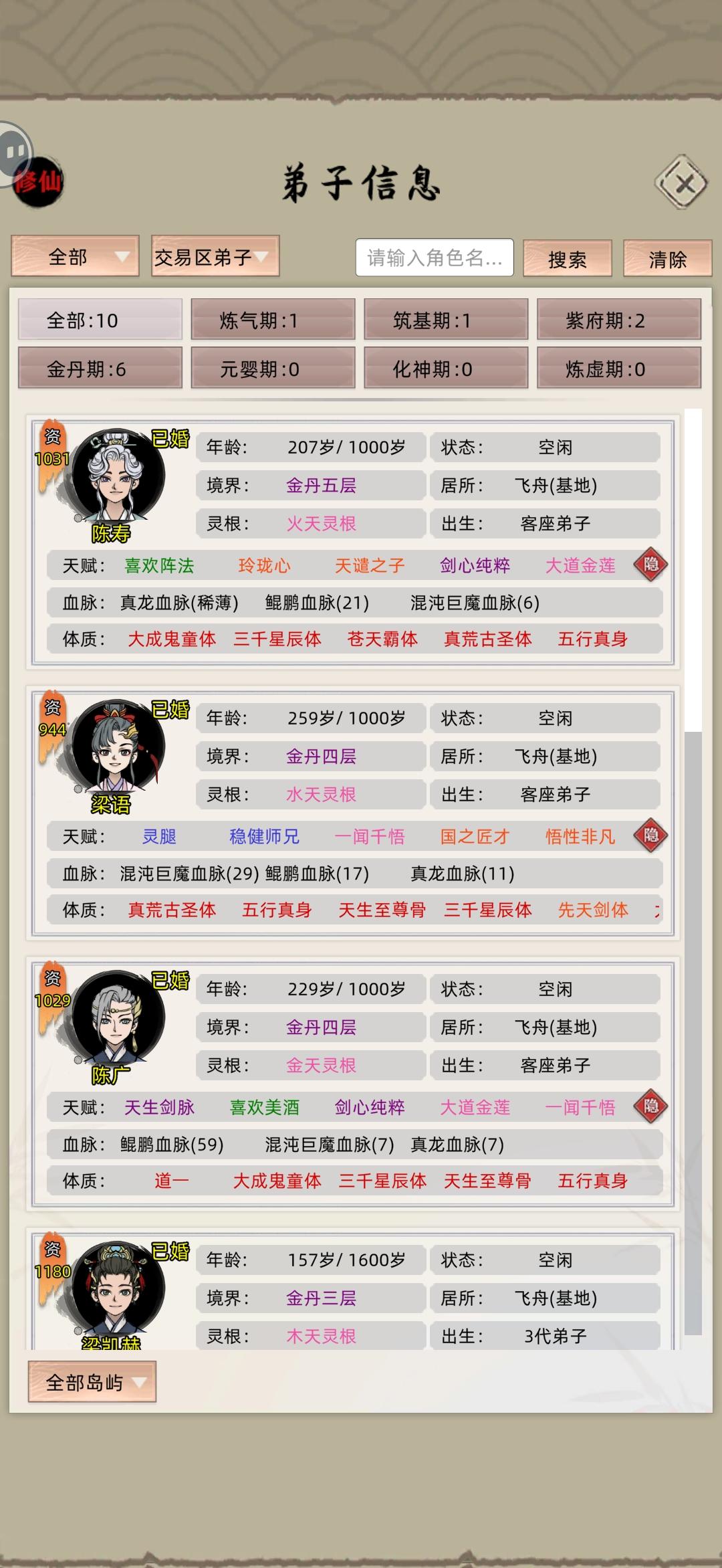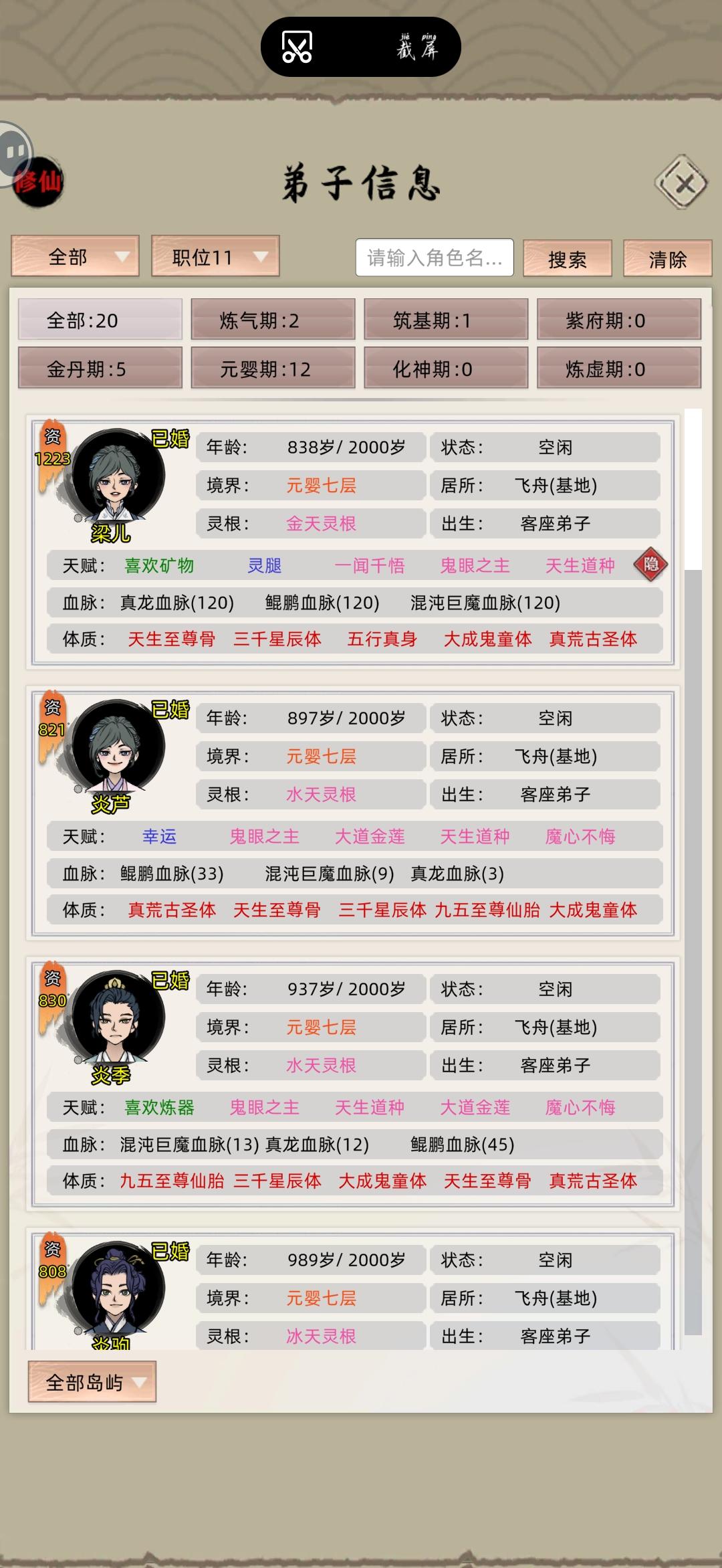 李青侯到手,血脉就收集完了,麒麟,巨魔,鲲鹏,3血脉收集完成。剩下的就是配体质了,不过也好配,毕竟全部名人都抓过来了。这个档很顺利,开局遇到朝夕问道花,直接老祖化神2了,100多年把全部名人都抓过来了。要不是升级升仙台没材料(拿仙道升仙令),耽误点时间,早配好了。算是最顺利的一个档。